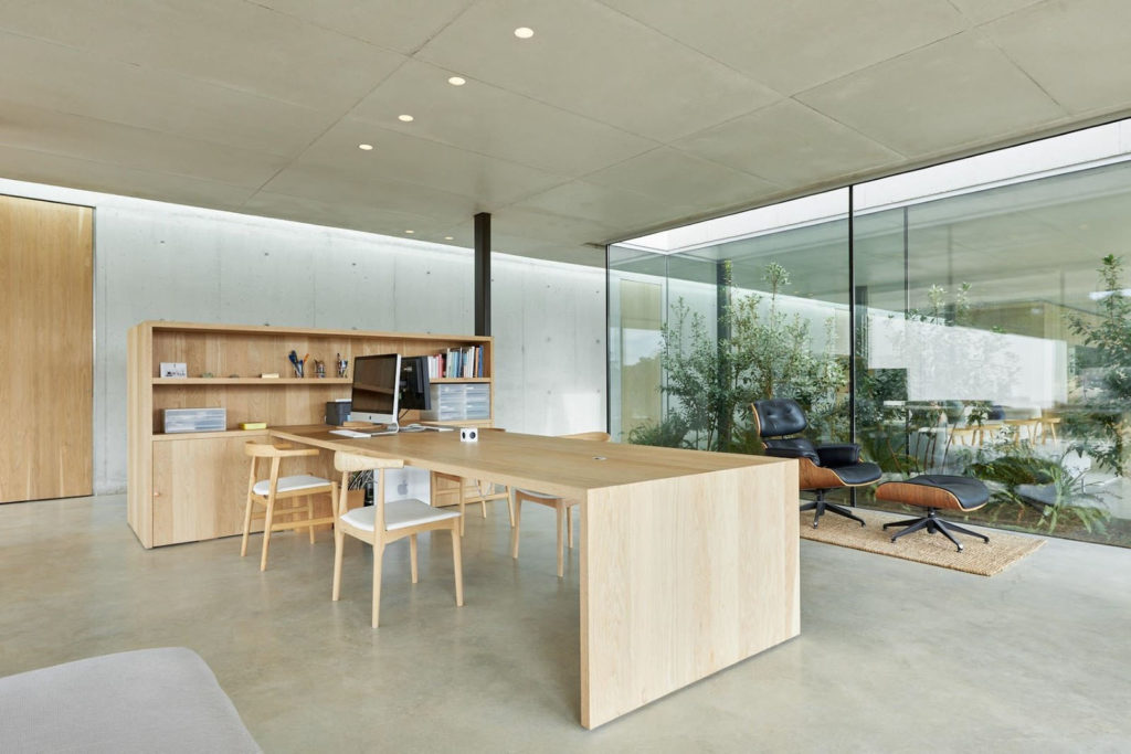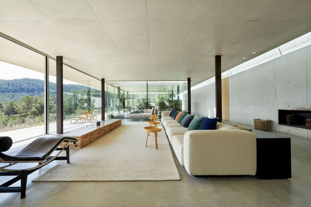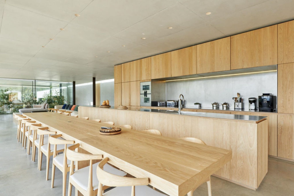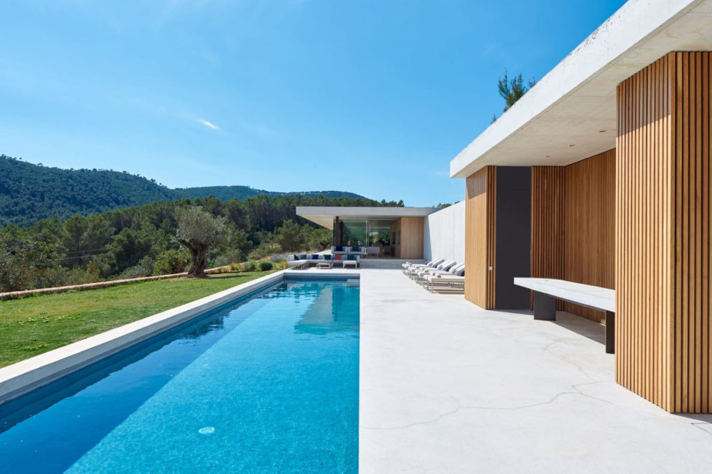 Erpicum has left materials raw across the boxy 7-bedroom house, which is on the market via Ibiza Sotheby’s International Realty, with price on application. Concrete floors and ceilings are offset by oak panelling and cabinetry, and wooden furniture throughout the home.