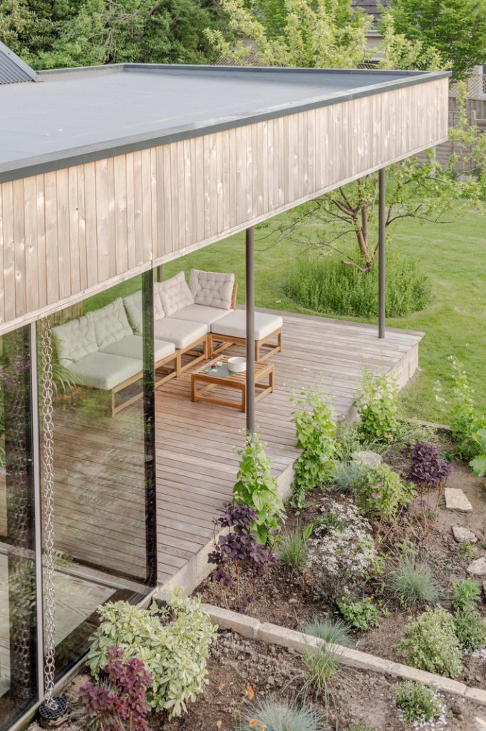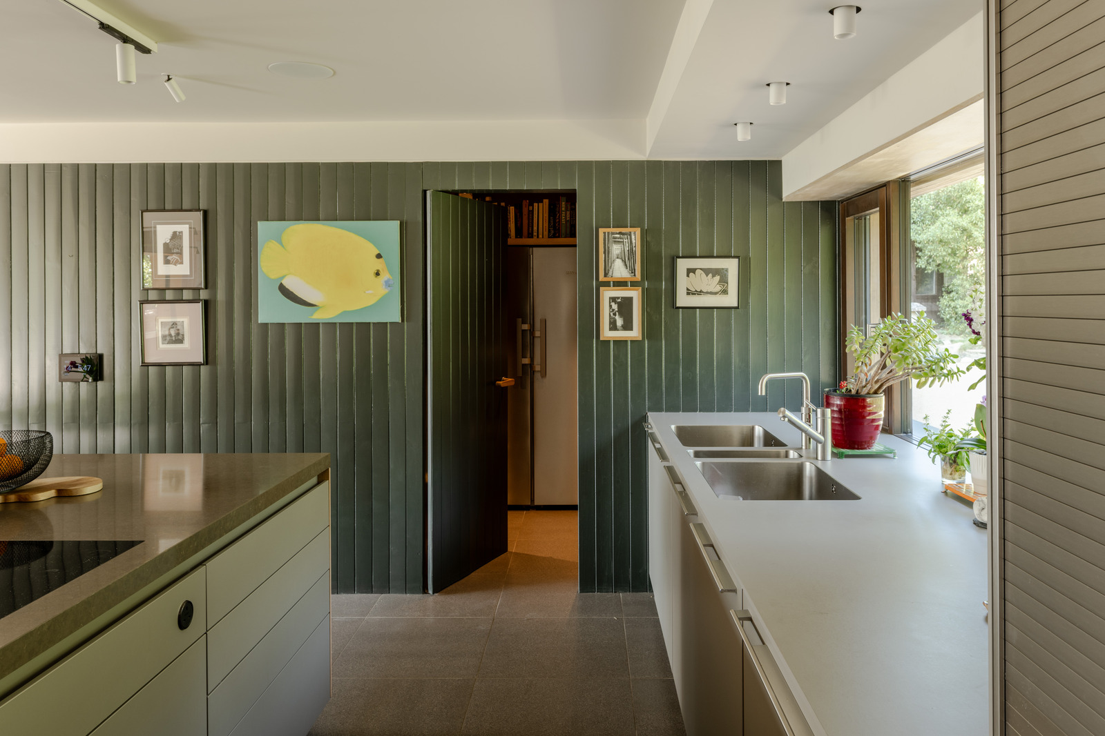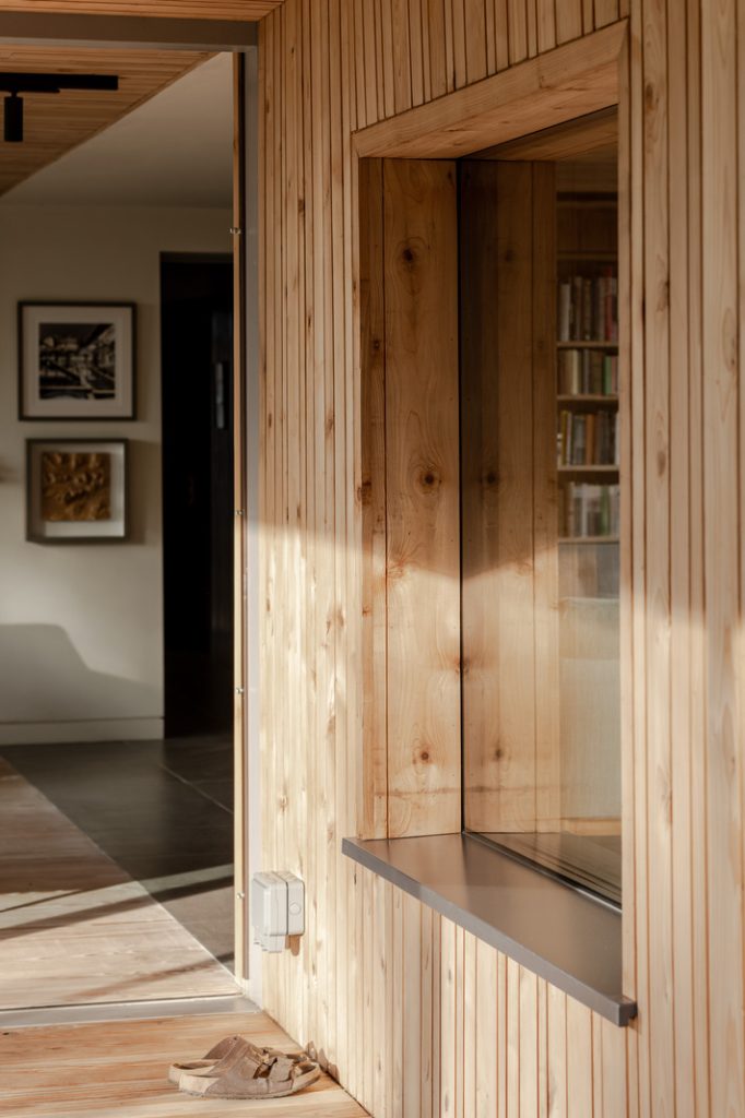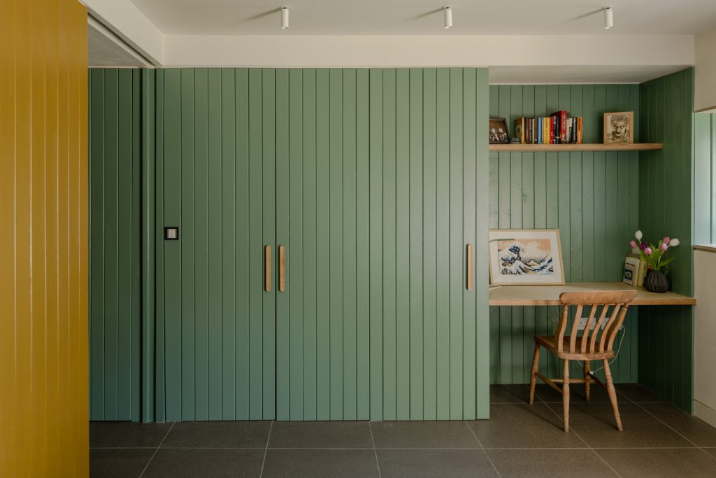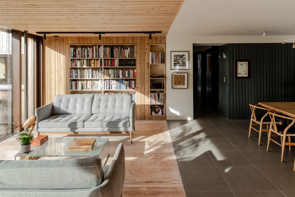 Working with an existing 1960s bungalow, Gresford rearranged the original interior into a series of painted wood ‘boxes’ that now form the core of the house. Then he configured living spaces that flow freely around the central hub. The main lounge, office and kitchen are separated by pocket doors and the dining area and sitting room open onto the gardens with sliding glass doors. Porcelain floors by Mosa and timber boards by Dinesen run throughout the main floor up to the deep veranda.