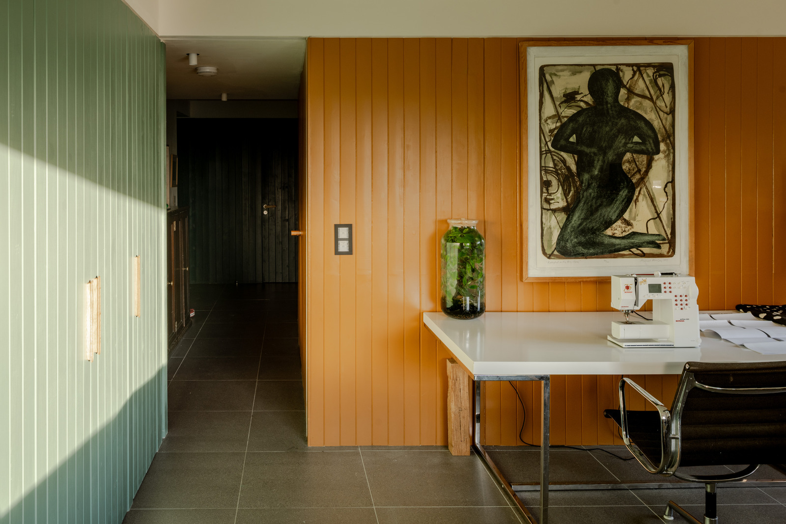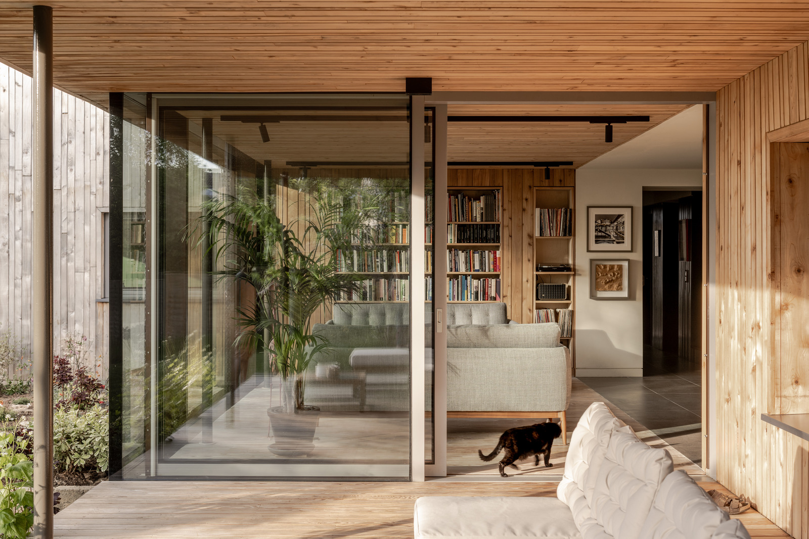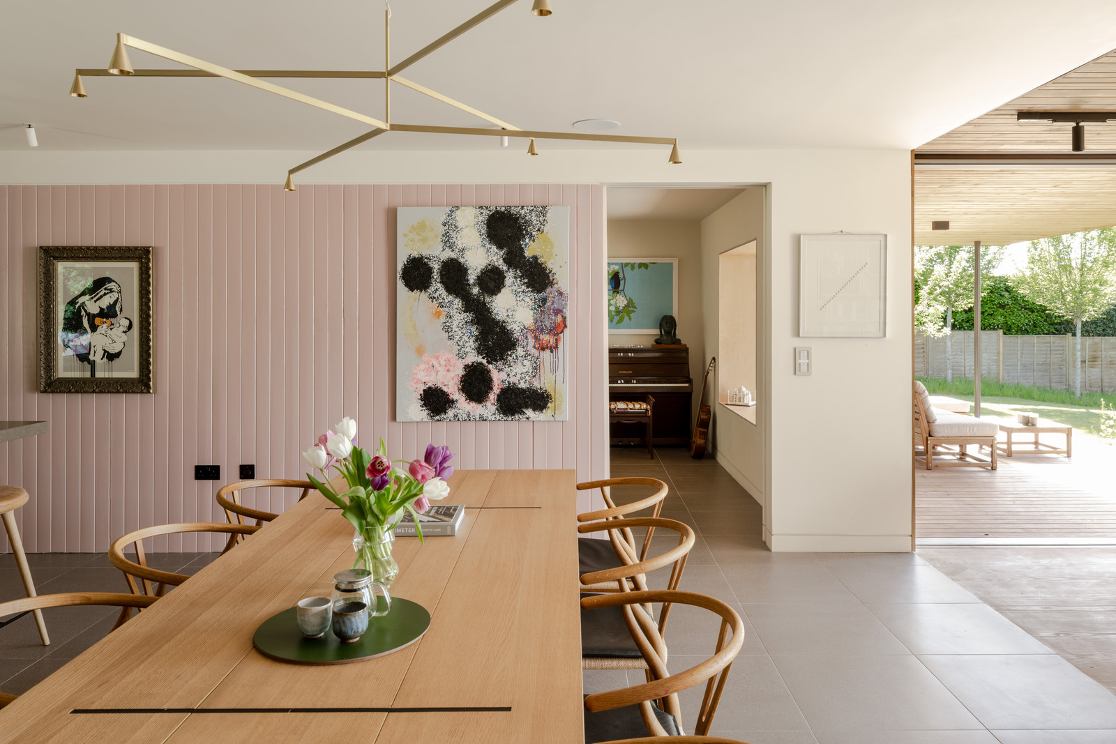 Working with an existing 1960s bungalow, Gresford rearranged the original interior into a series of painted wood ‘boxes’ that now form the core of the house. Then he configured living spaces that flow freely around the central hub. The main lounge, office and kitchen are separated by pocket doors and the dining area and sitting room open onto the gardens with sliding glass doors. Porcelain floors by Mosa and timber boards by Dinesen run throughout the main floor up to the deep veranda.