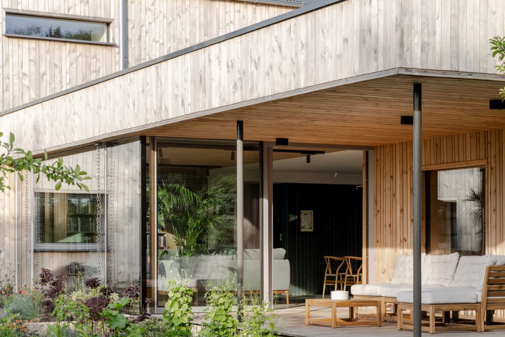 An upper storey with three bedrooms brings the total living space to 3,200 sqft. The main bedroom, with an en suite, overlooks a northwest swath of the property and a powder-coated corrugated-steel roof is fitted with skylights to bring natural daylight into the bedrooms. But the home’s most compelling feature is its textural wood siding, harvested from 14 western red cedars that grew on the site and machined at the onset of the project.