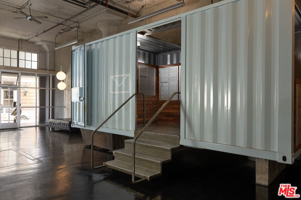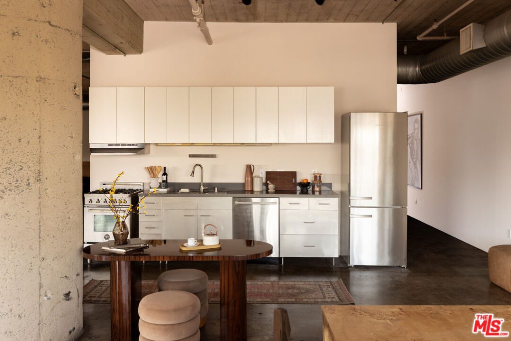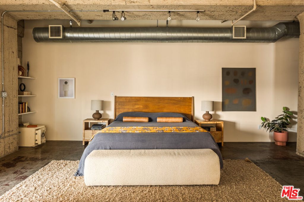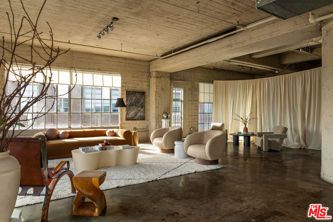 Steel casement windows line two walls of this corner residence at the Toy Factory Lofts, a former manufacturing complex reworked for residential use in the Arts District of downtown Los Angeles. The 1,941sqft interior retains the proportions associated with early industrial architecture — soaring ceilings, exposed concrete and an open structural grid — while daylight tracks across polished concrete floors throughout the day. The property is listed for $1,499,000.