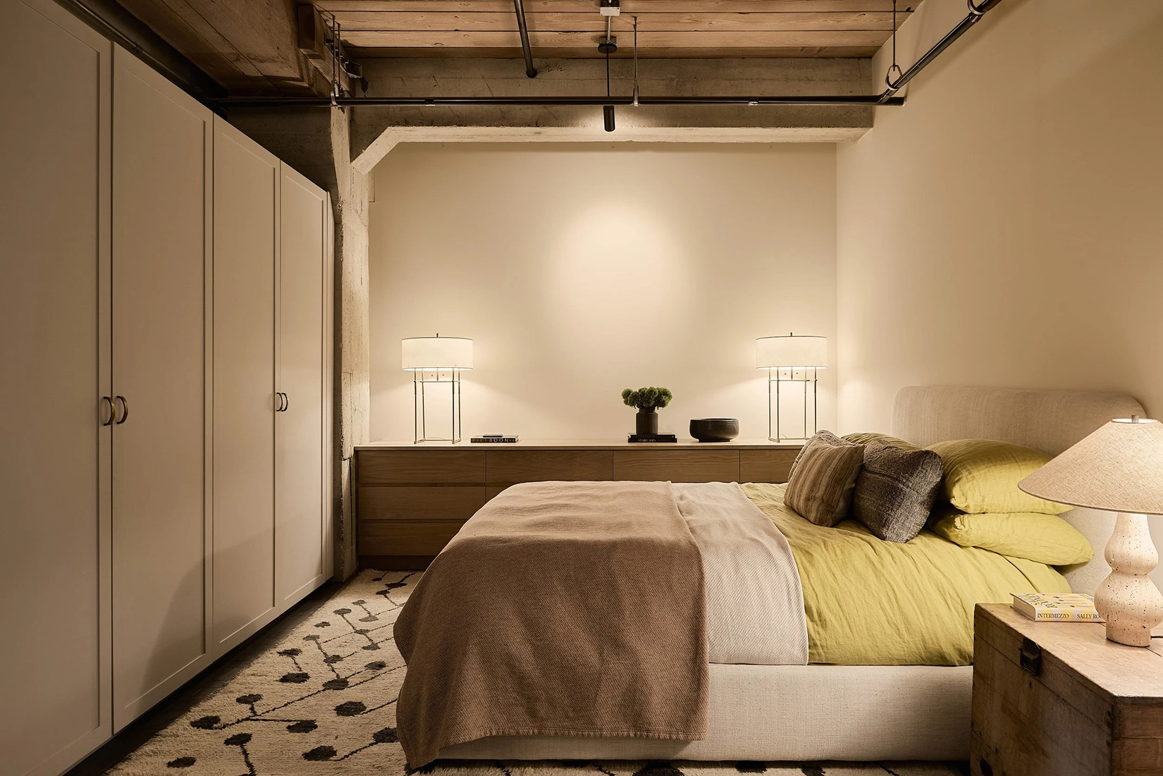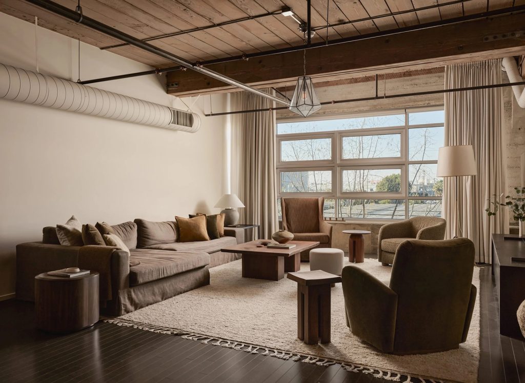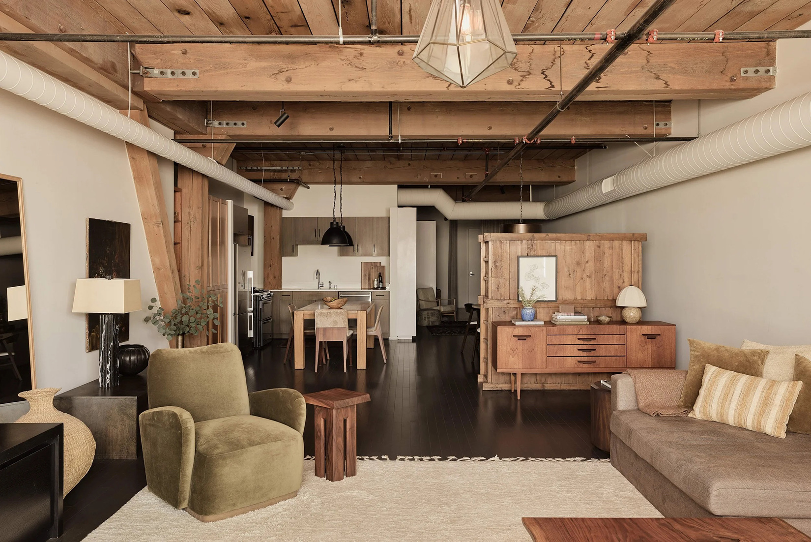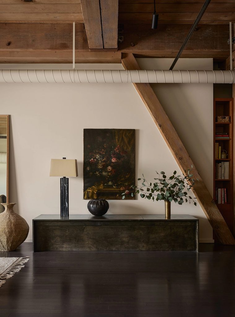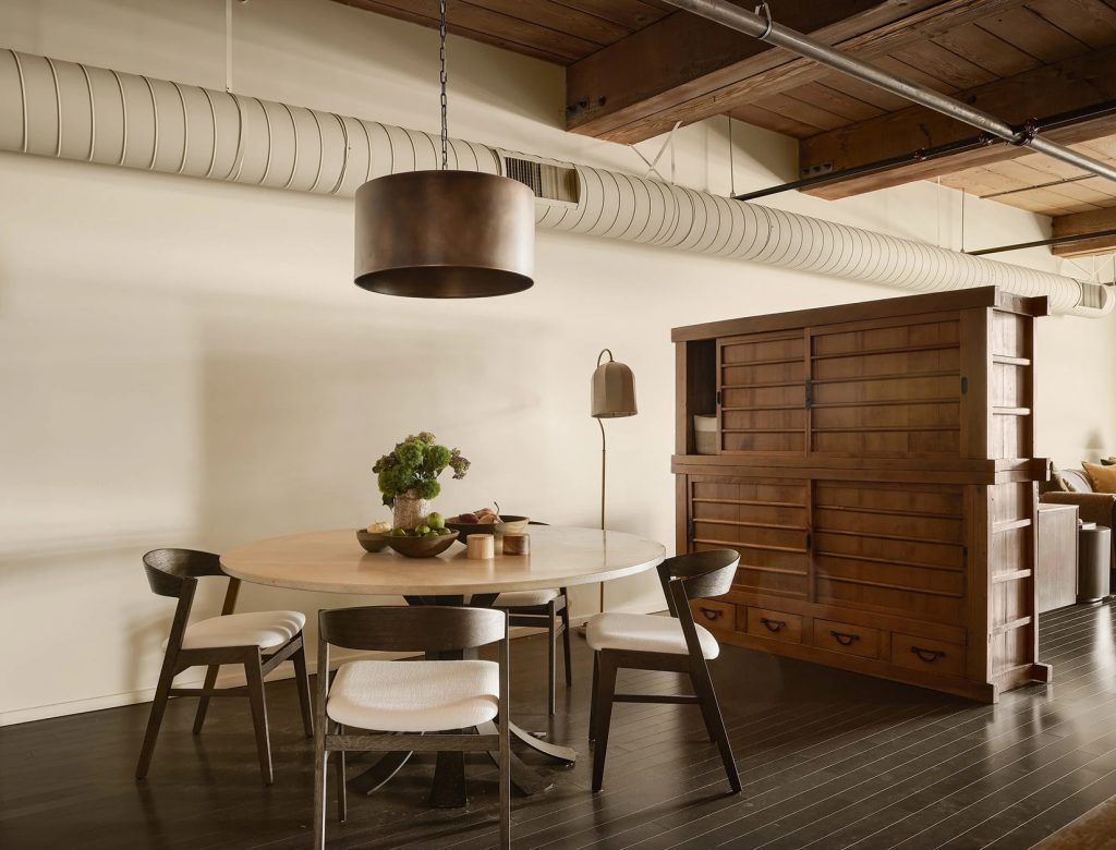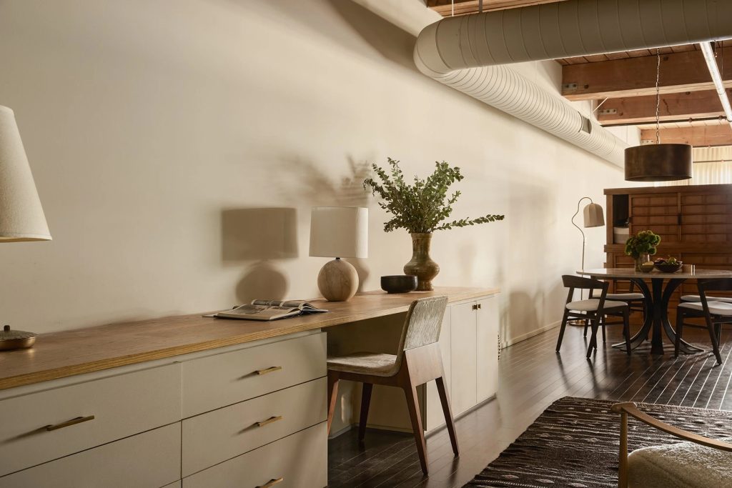 The 1,512sqft interior has been overhauled by DISC Interiors, a practice whose work balances scale with warmth. Exposed-beam ceilings nearly 11 feet high sit above hardwood floors, while painted ducting and warm white walls soften the volume without erasing its character. Custom cabinetry is integrated throughout, including a wall of bookshelves with a long built-in desk that subtly divides entry and dining zones without interrupting flow. The open kitchen anchors the plan with updated appliances and a restrained material palette suited to everyday use as much as entertaining.