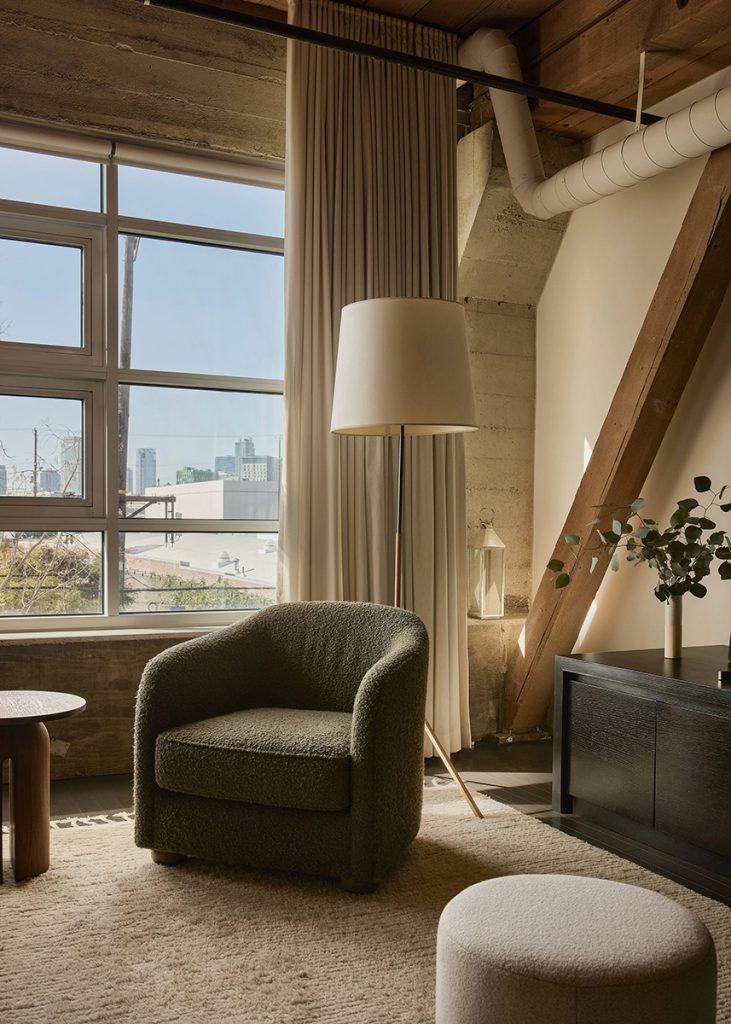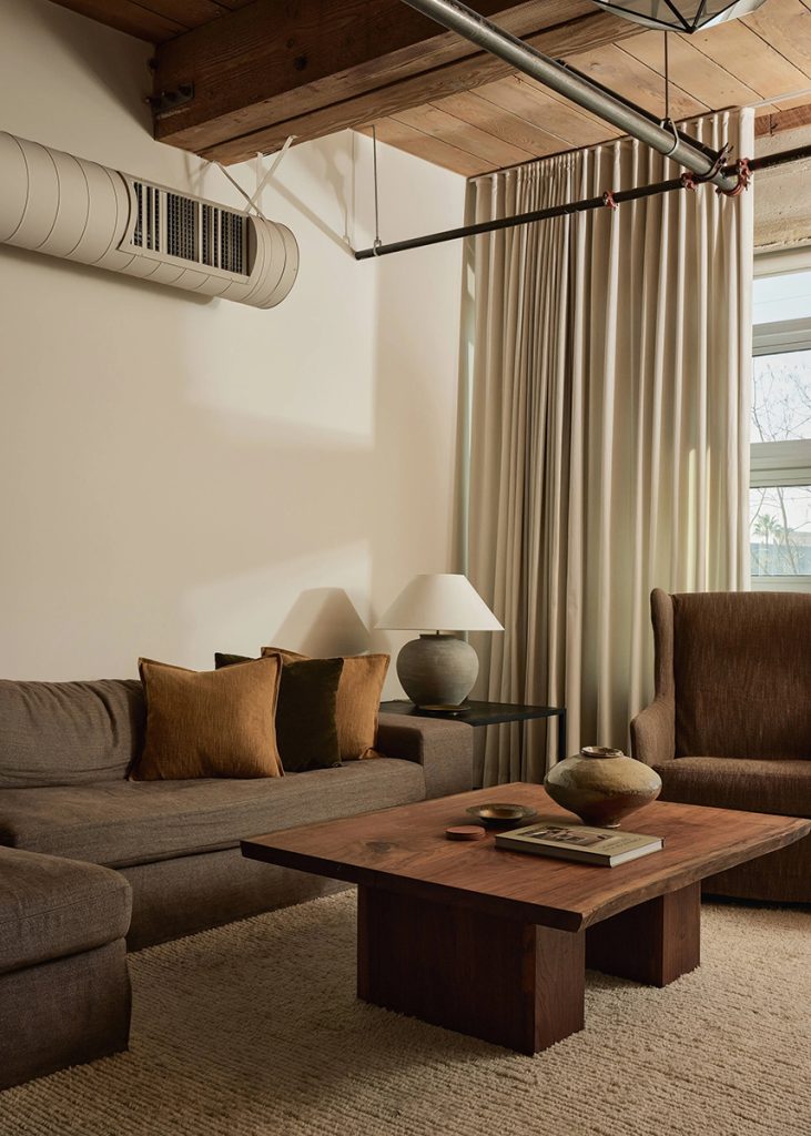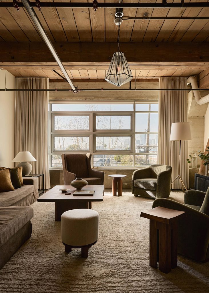 The bedroom is deliberately calm, screened by custom curtains and lined with tailored storage, including oak cabinetry and antique brass hardware. A full bathroom incorporates in-unit laundry, maintaining the apartment’s efficient footprint. Residents of the historic Barker Block have access to shared amenities including a rooftop pool, spa and fitness centre, alongside communal outdoor spaces that overlook downtown Los Angeles. The loft is listed for $1.05 million with Take Sunset.