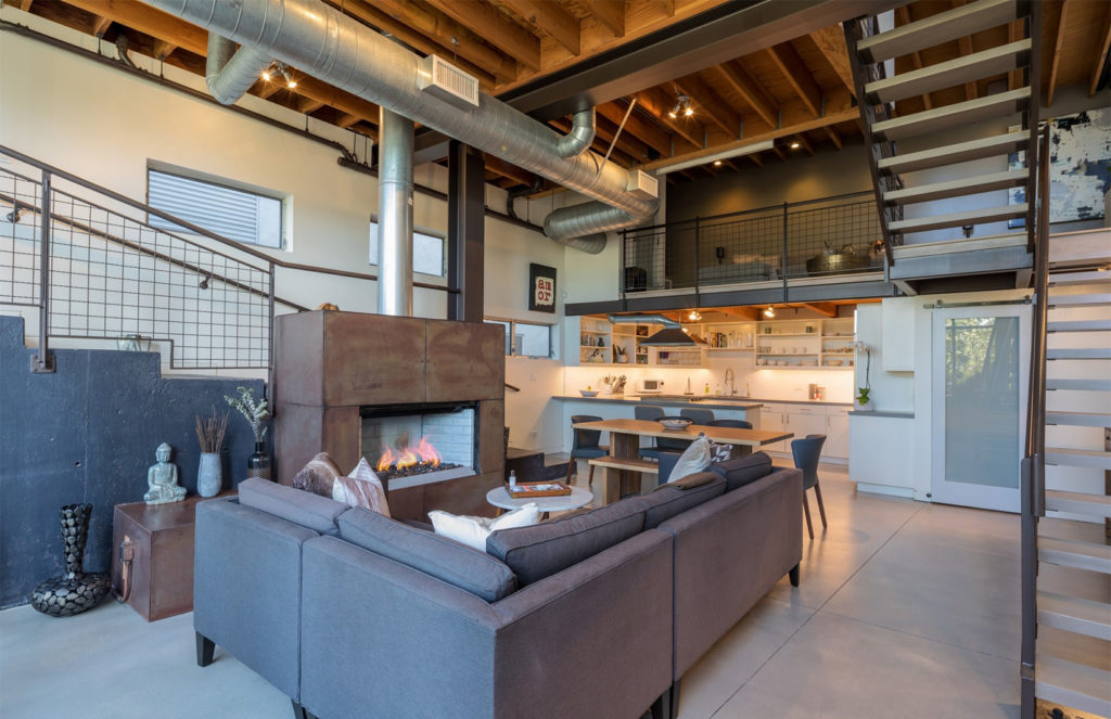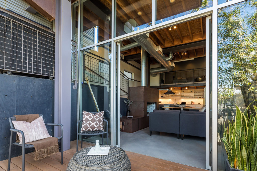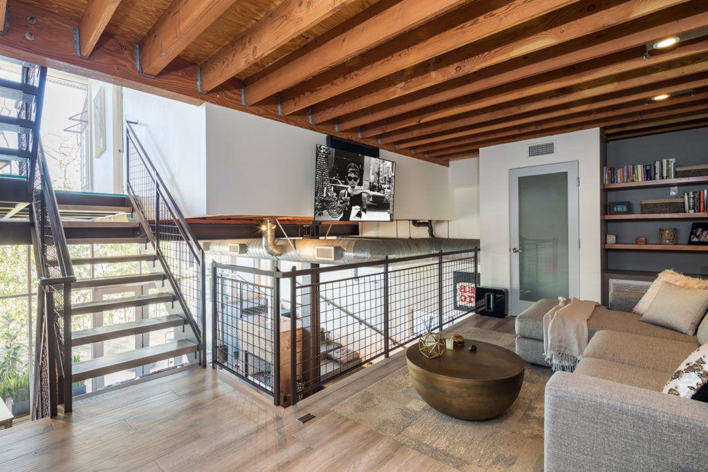 Wood, steel and glass combine inside the two-bedroom Venice Beach property – on the market via listing agent Nancy Osborne of Halton Pardee for $2.249m. It features 14-ft-high ceilings, concrete floors and a steel-grate staircase.