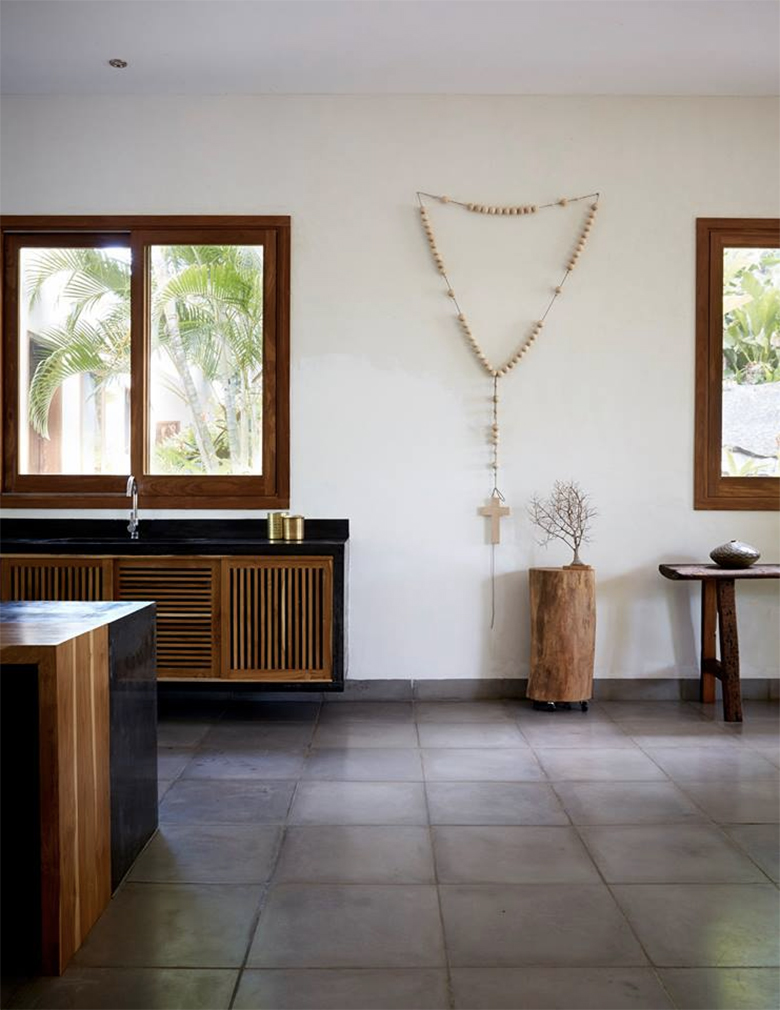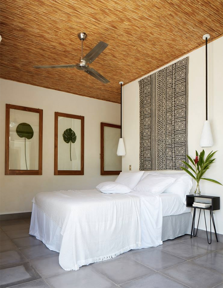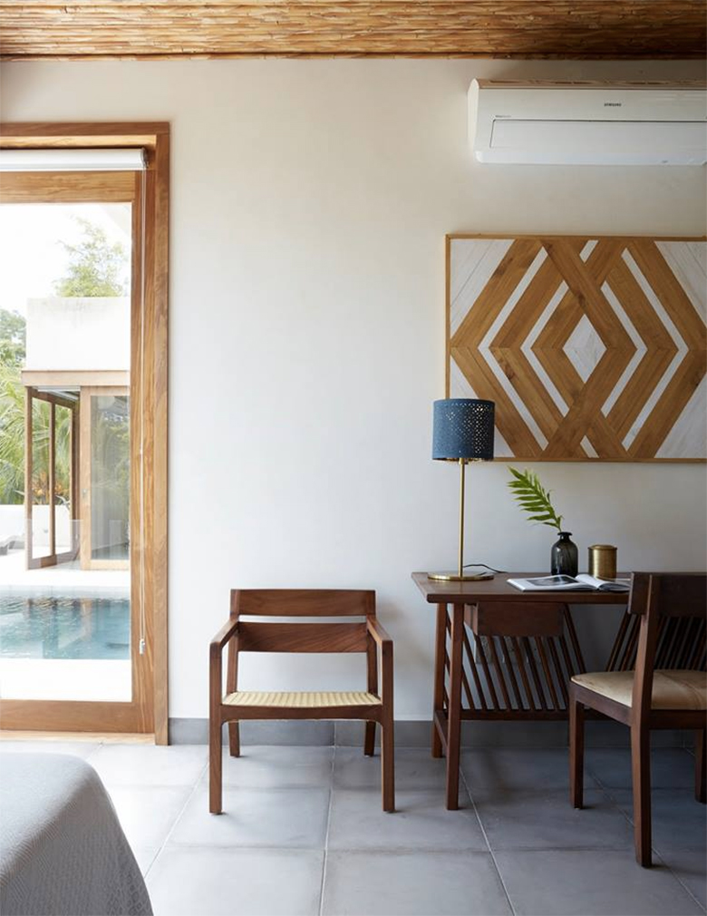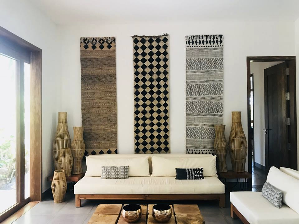 Its design is simple and elegant throughout, a combination of white furnishings and local wooden detailing. The decorative elements – wall hangings, tiles, furniture – have largely been locally sourced.