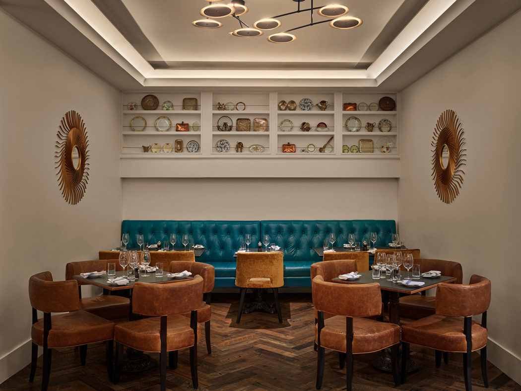 Original stained glass, a grand marble staircase and rich copper cornices set the tone for DesignAgency’s interventions in the four-storey space, the most dramatic of which is the octagonal marble and olive wood bar that fills Leña Restaurante’s street-level.