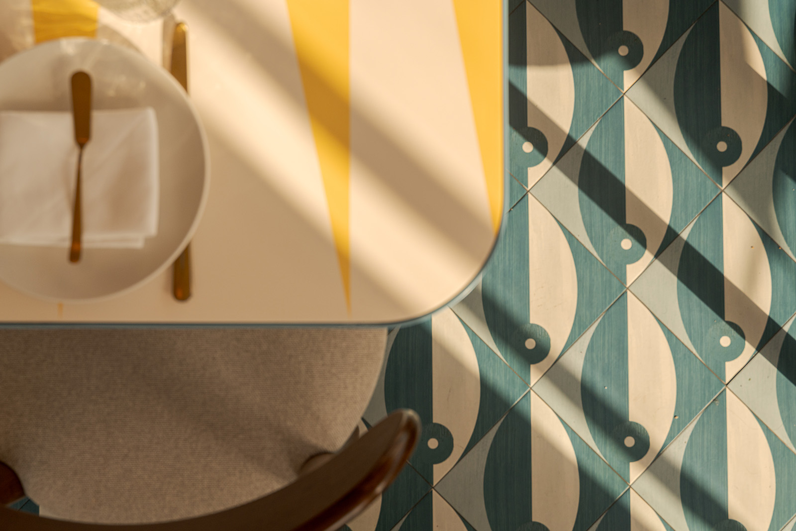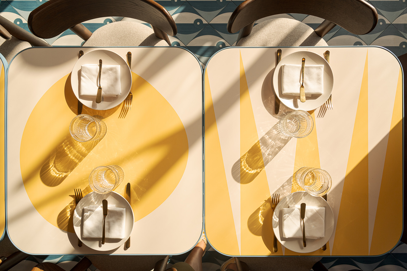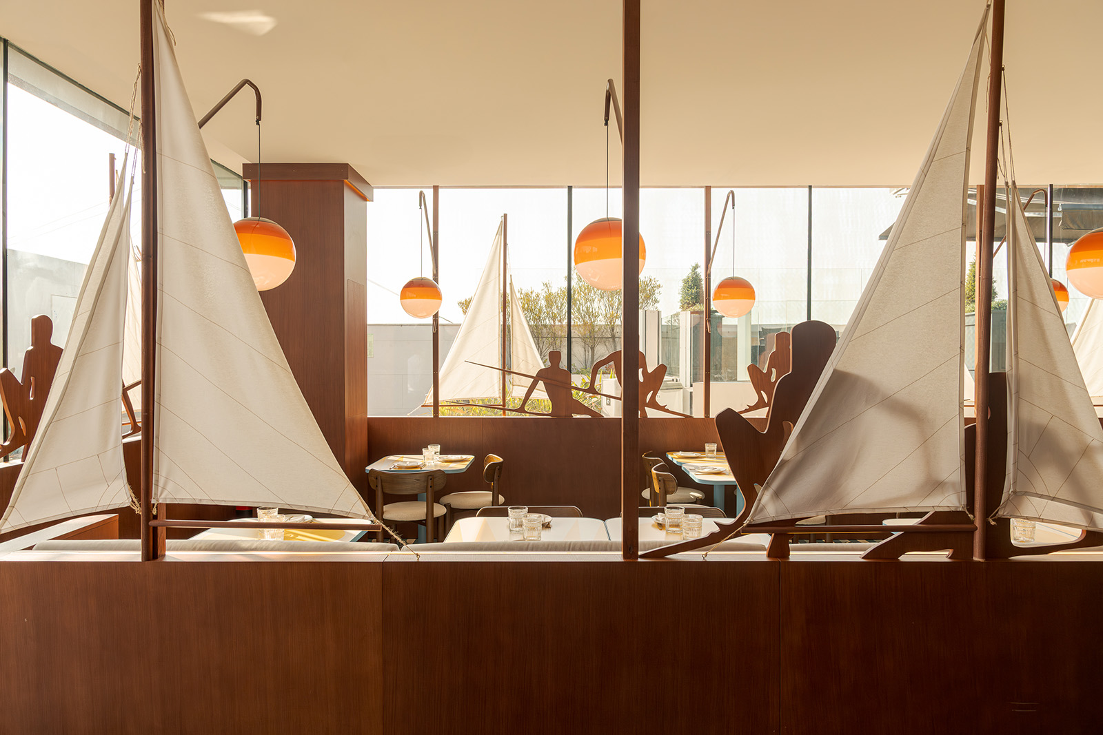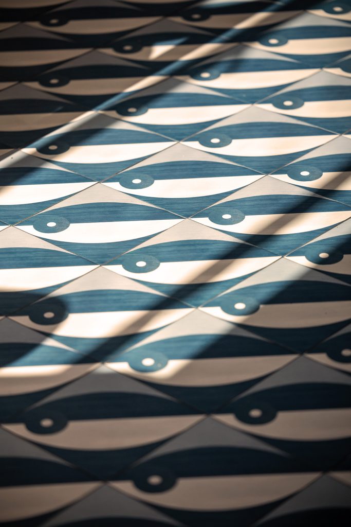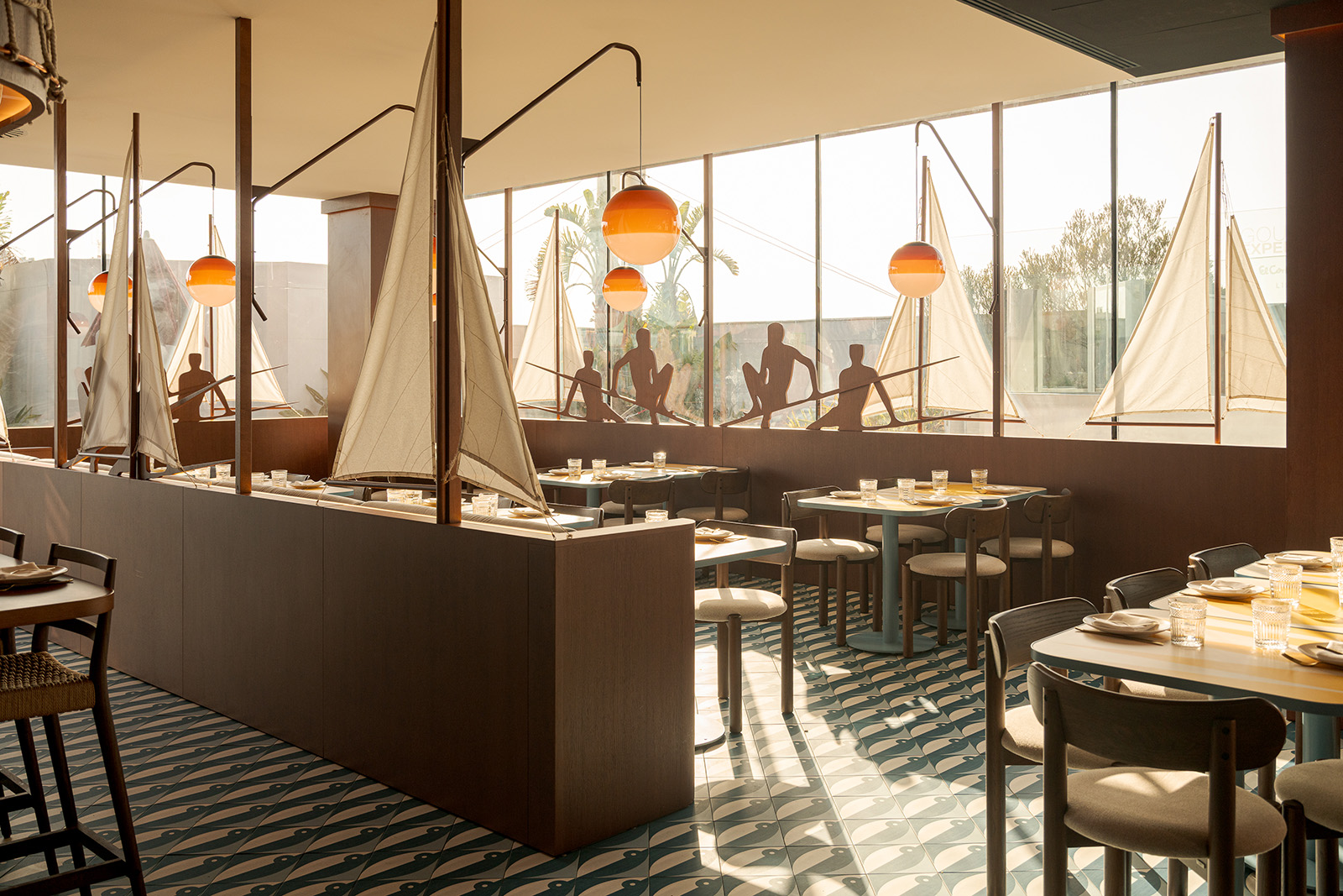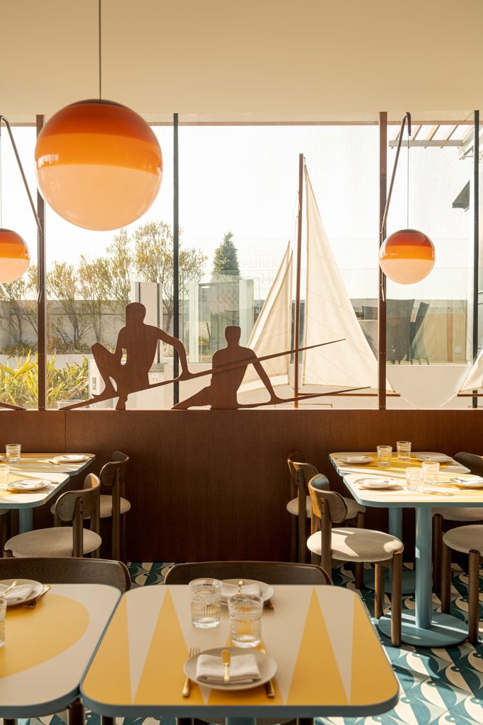 Creative director Alejandro Cateto responded to the brief with an exuberant space that evokes sunlight, sailing and the tiled surfaces around Portugal and Brazil. He’s wrapped the space in a warm wooden envelope reminiscent of teak ship cabins and laid down hundreds of trompe l’oeil tiles that resemble schools of tropical fish. Retro patterns on the tables and seat cushions give off a balmy, beachy vibe.