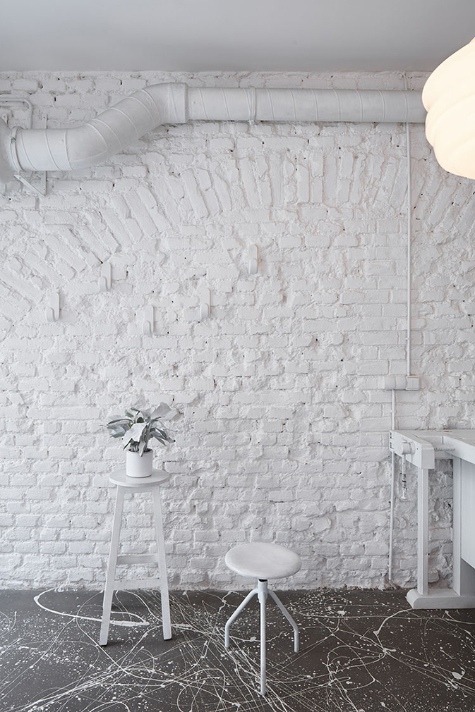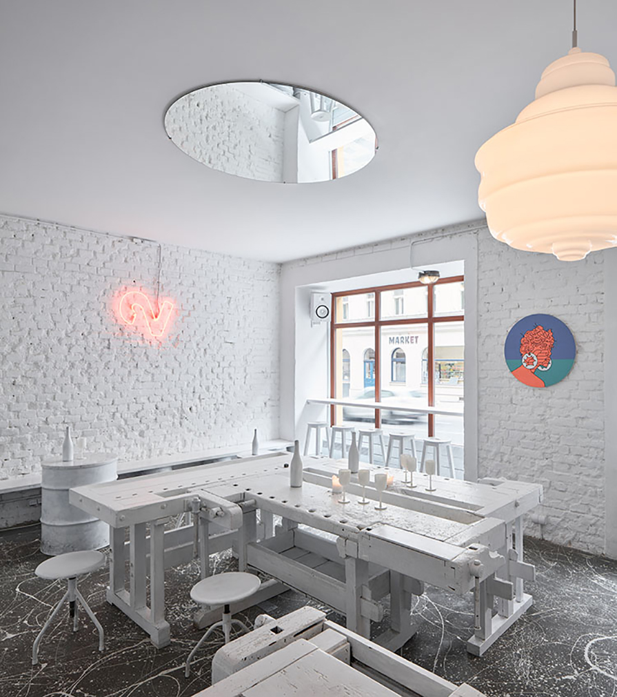 Local designers Jan Plechac and Henry Wielgus oversaw the ultra-minimal interiors for Dvojka, covering brick walls, empty wine bottles and wooden furniture in gallons of white paint for the watering hole’s gallerist owner.