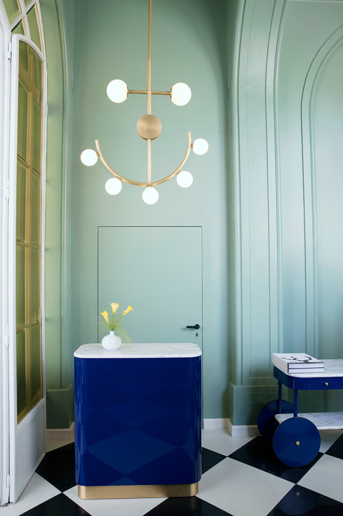 Walls have been painted a vivid green, and ceilings strung with dramatic chandeliers made with conical shades and funnel-like fixtures.