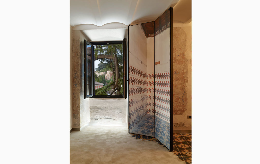 The Rooms of Rome is housed within Fondazione Alda Fendi – Esperimenti, a sprawling five storey exhibition space and cultural hub overlooking the ancient Arch of Janus. Sandwiched between the art spaces and rooftop restaurant are 24 unique serviced apartments with interiors designed by Jean Nouvel who blends the existing architecture with bold colour intervention, elaborate tiling and sleek, minimalist furniture.