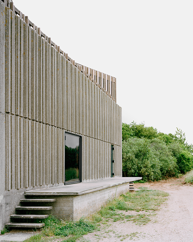 Spruce has been used across the extensions and interior additions, assembled to echo the pattern and rhythm of the concrete relief. ‘Parts of the wood are quite soft,’ says Sebastian Skovsted. ‘In a few years, the wood will get rough and take on a gray patina after exposure to the elements. It works really well with the concrete.’