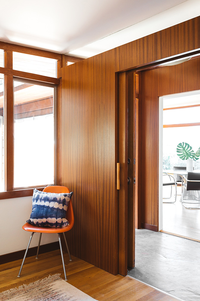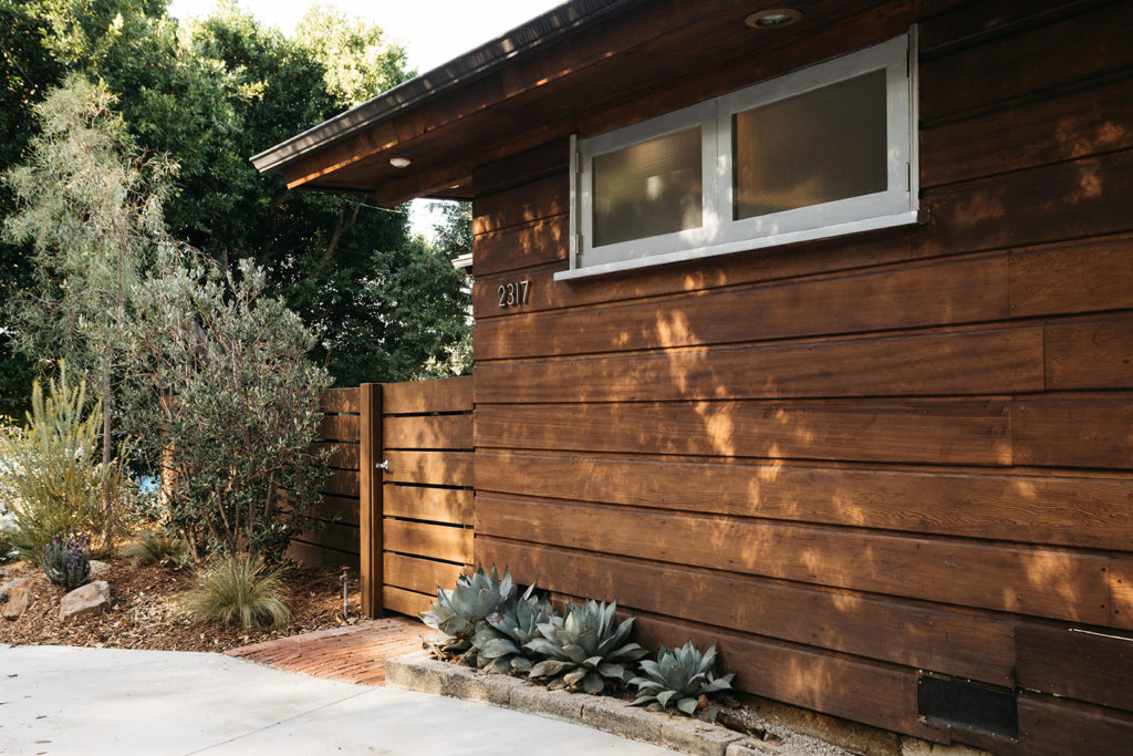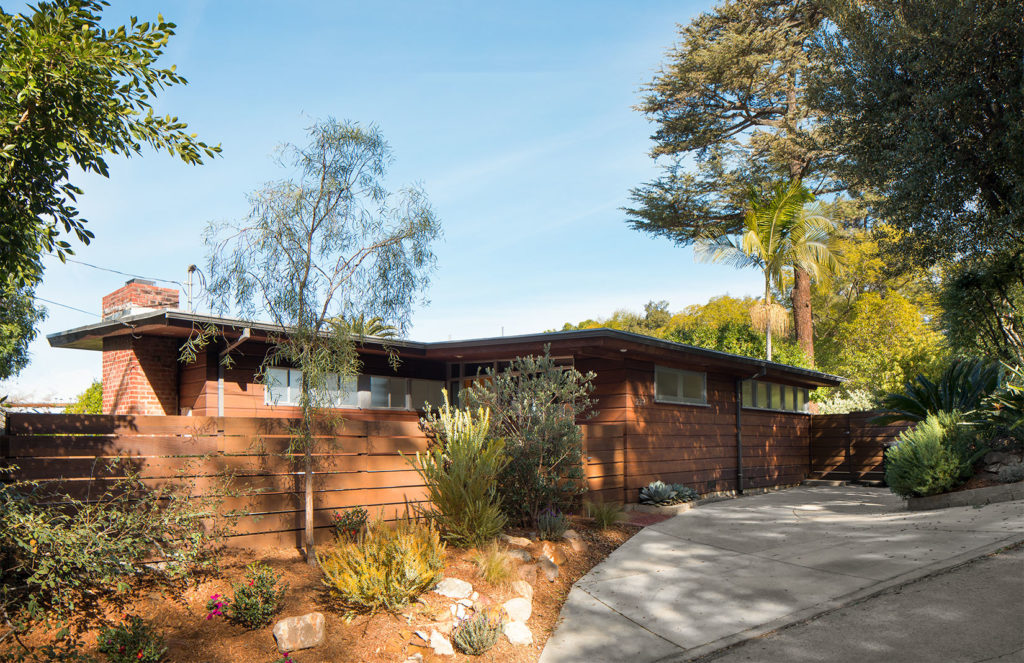 He tapped midcentury architect John Kewell to build the cantilevered post-and-beam dwelling. The Silver Lake property at 2317 Bancroft Avenue has a low lying, timber-clad exterior that leads into cabin-like interiors.
