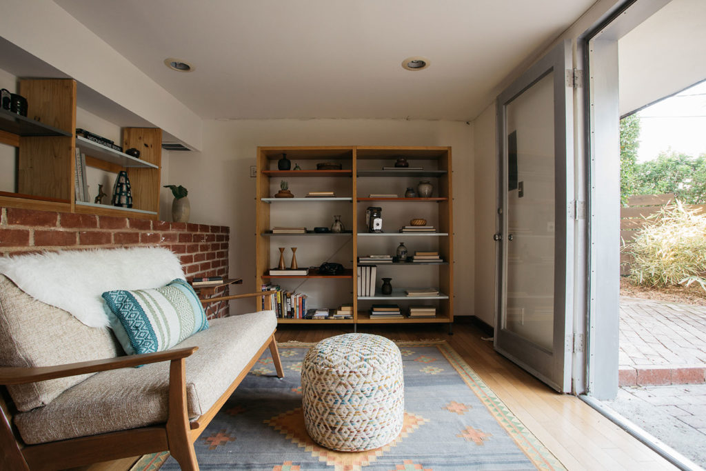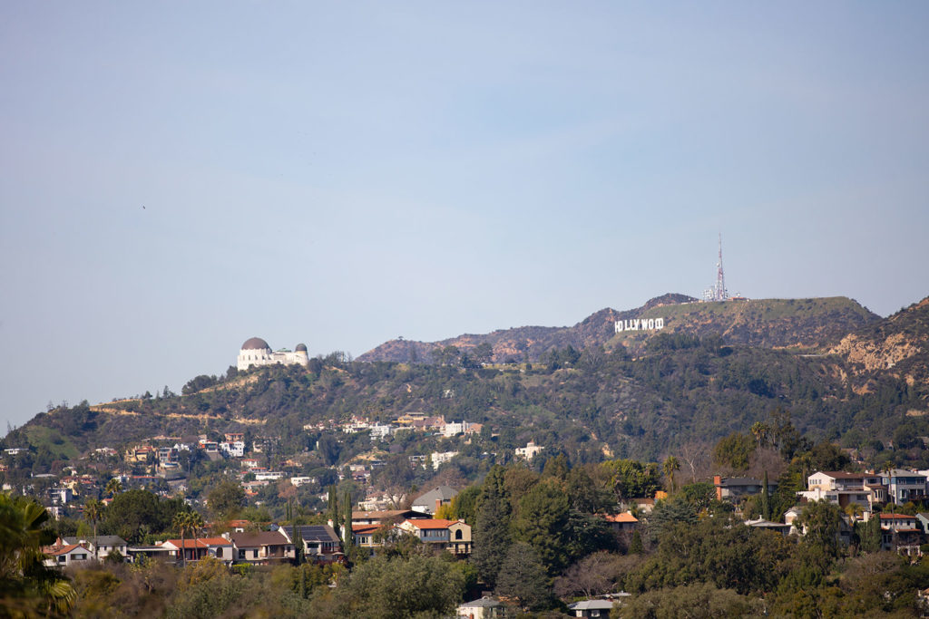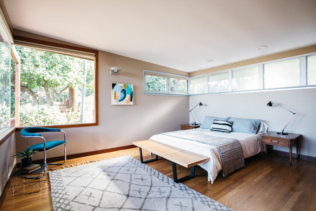 Floor-to-ceiling glass in the living room frames vistas of Silver Lake Reservoir and the Hollywood sign while timber walls and floors lend a rustic vibe that’s tightened via contemporary furnishings.