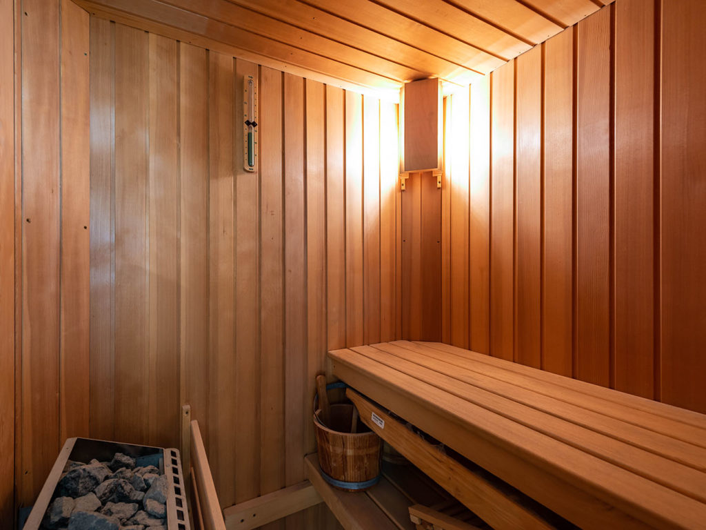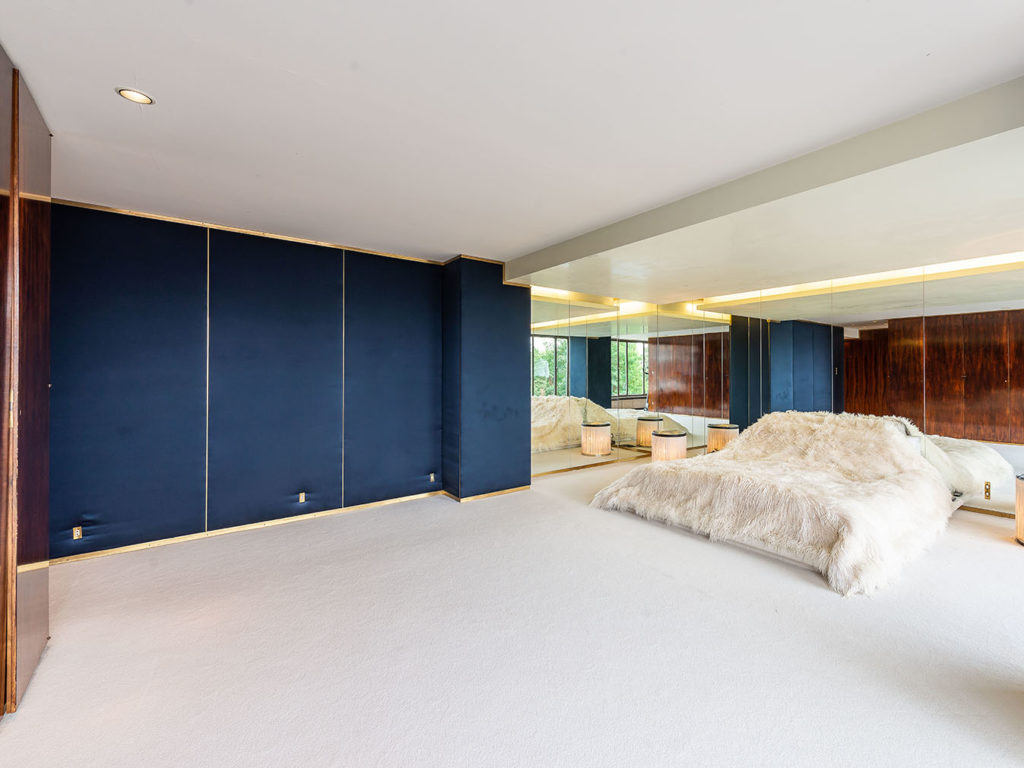 The tiled mezzanine library is accessed via a geometric wooden staircase and overlooks the living room below. It leads to two bedrooms – the master of which is a vast 50 sqm space.