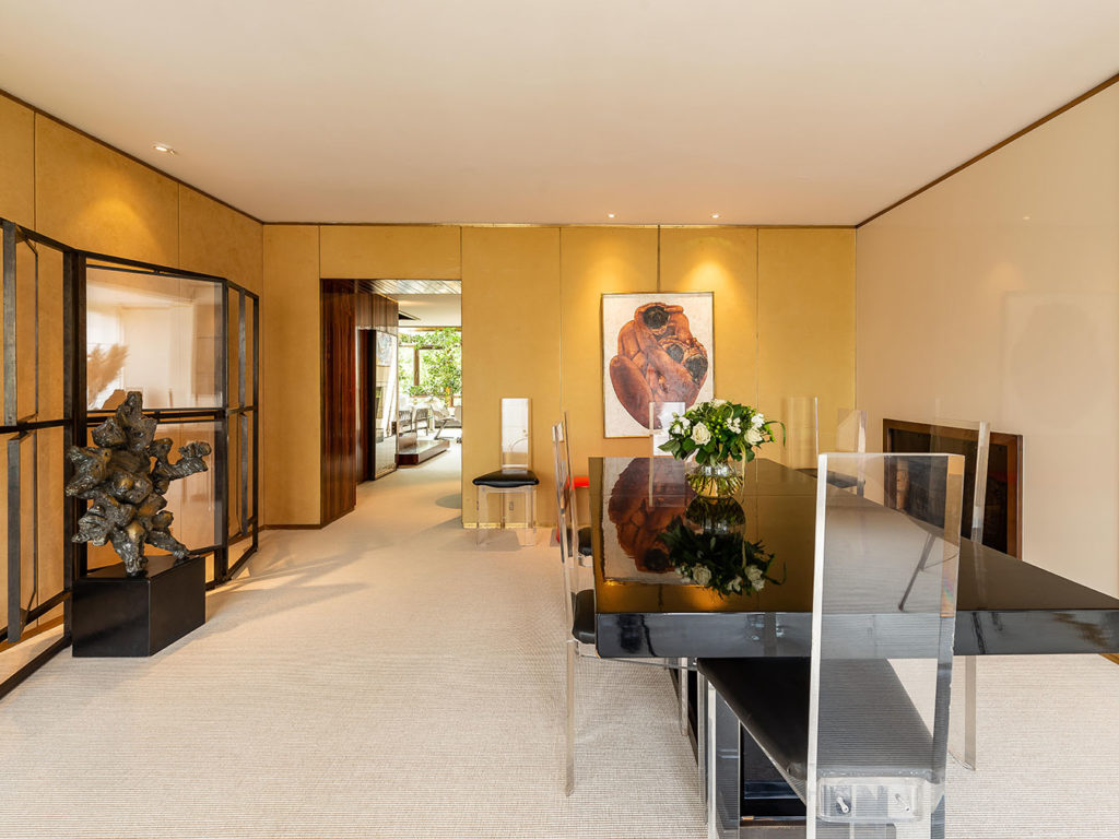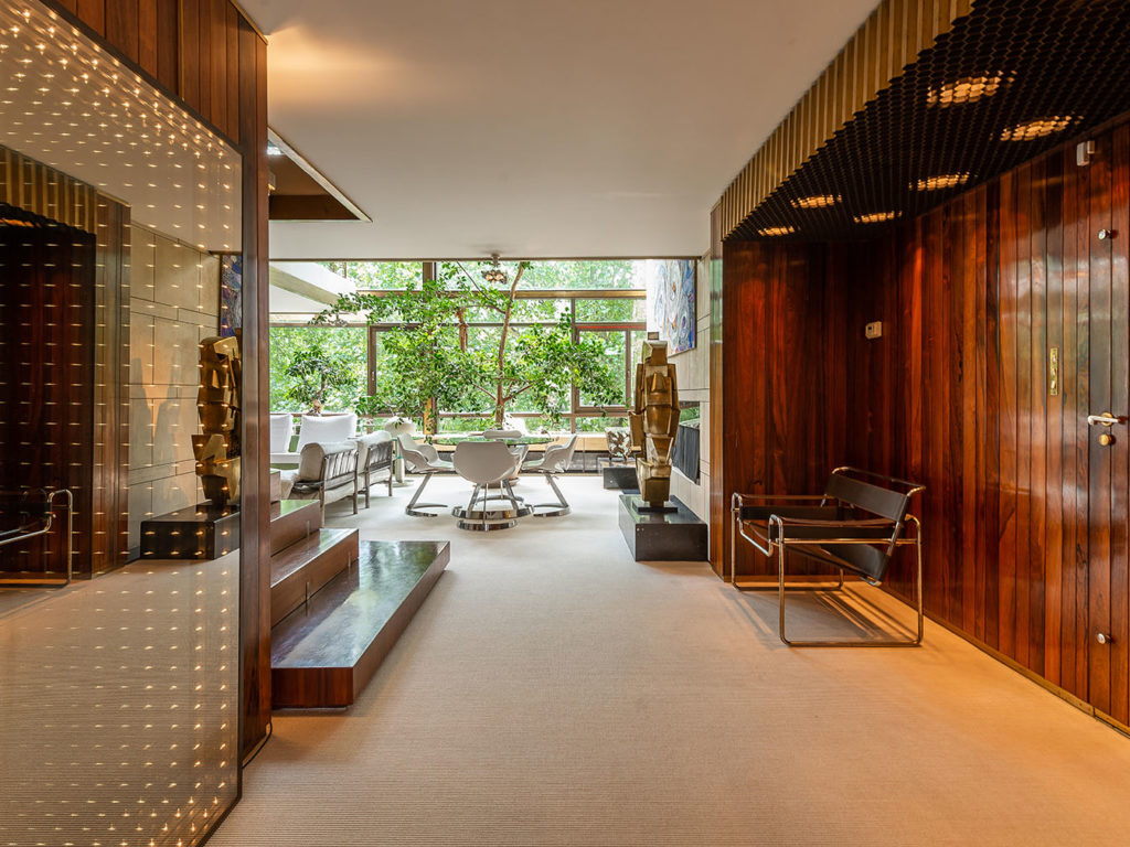 A rosewood panelled hallway leads into the Brussels property’s double height reception room, while brass, steel and marble elements can be found across the kitchen, dining room and upper level.