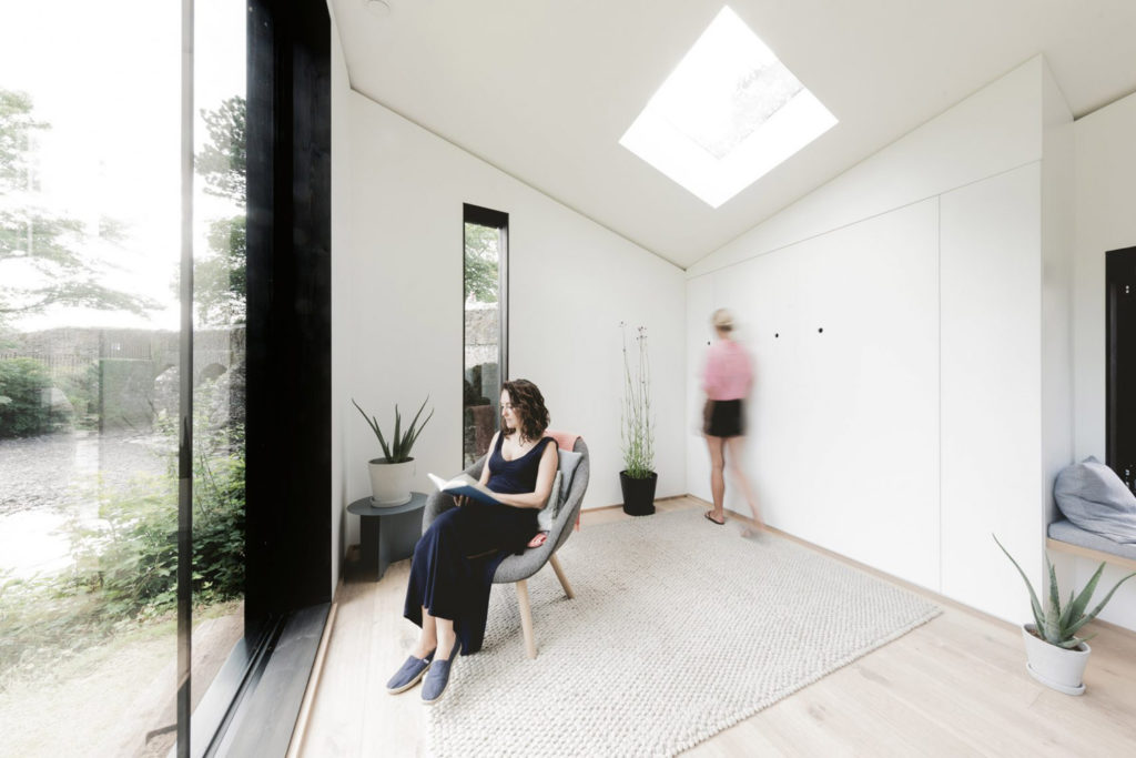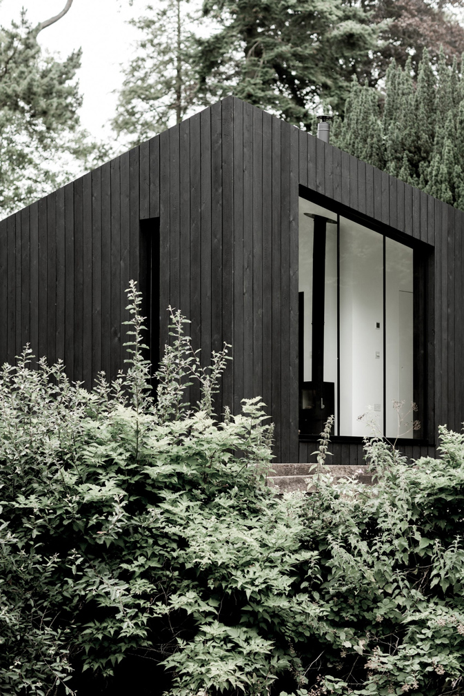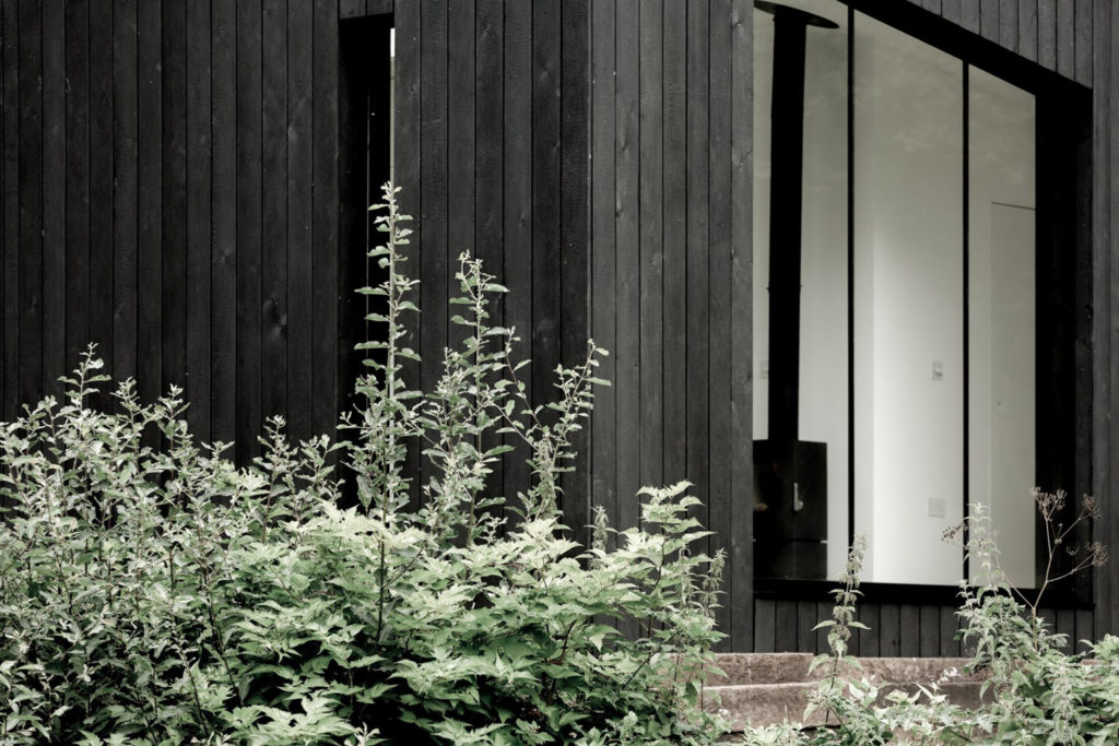 The basic Koto prefab home is a wedge-shaped structure with a diagonal roof and is clad in blackened timber. Light is channeled into the dwelling via a floor-to-ceiling glass façade and a skylight set into its sloping roof.