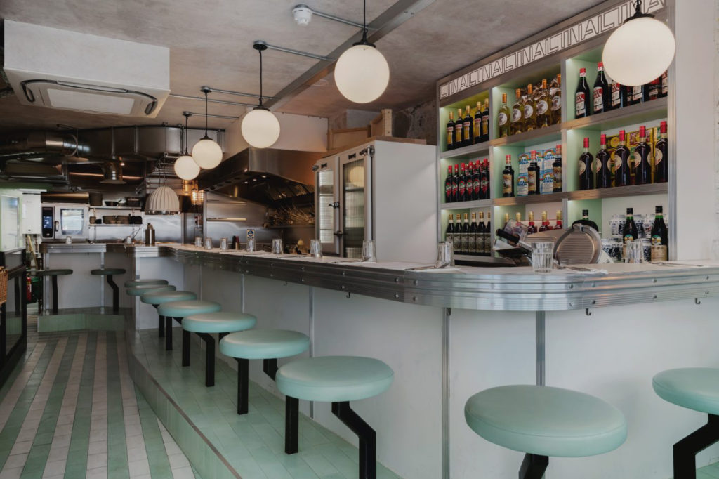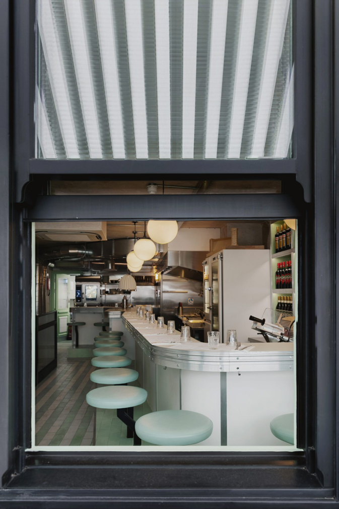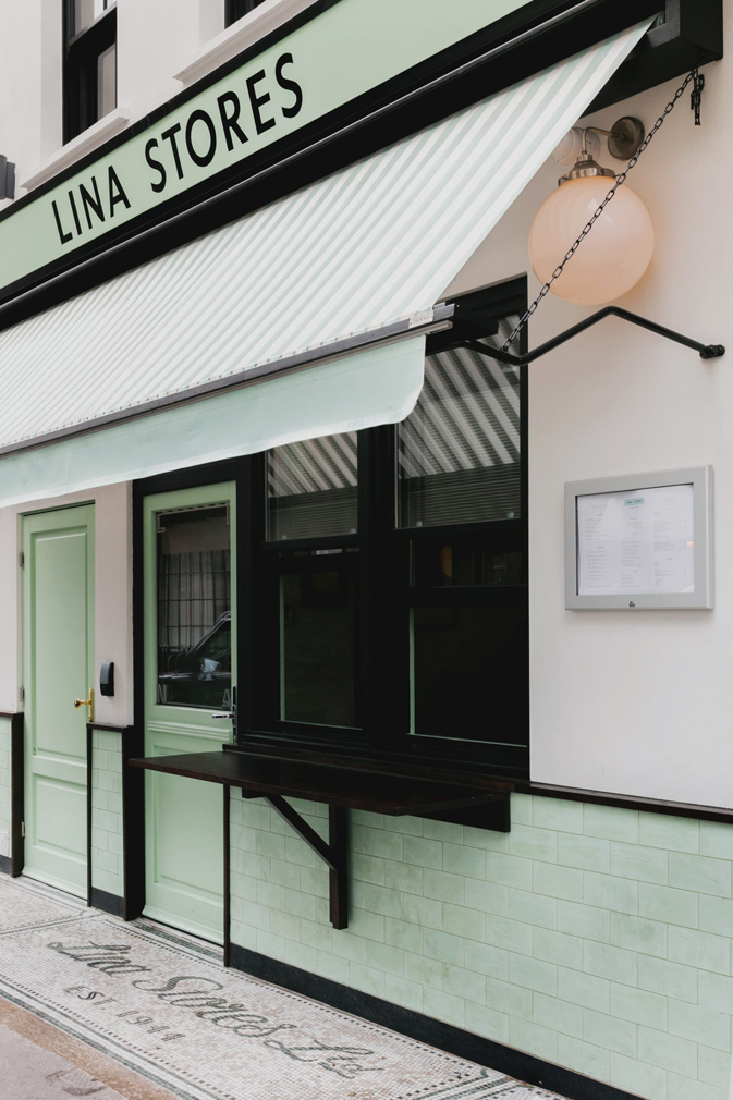 Lina’s familiar pistachio green tiles and black-and-white colour palette envelopes the two-storey space. These peppermint candy hues are echoed in the London restaurant’s outside awning.