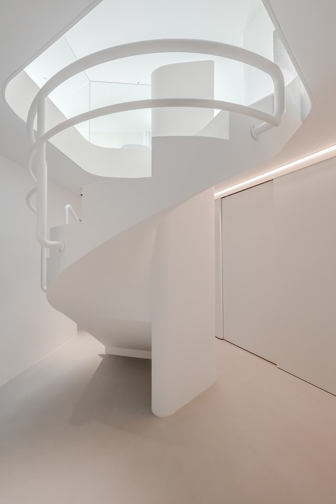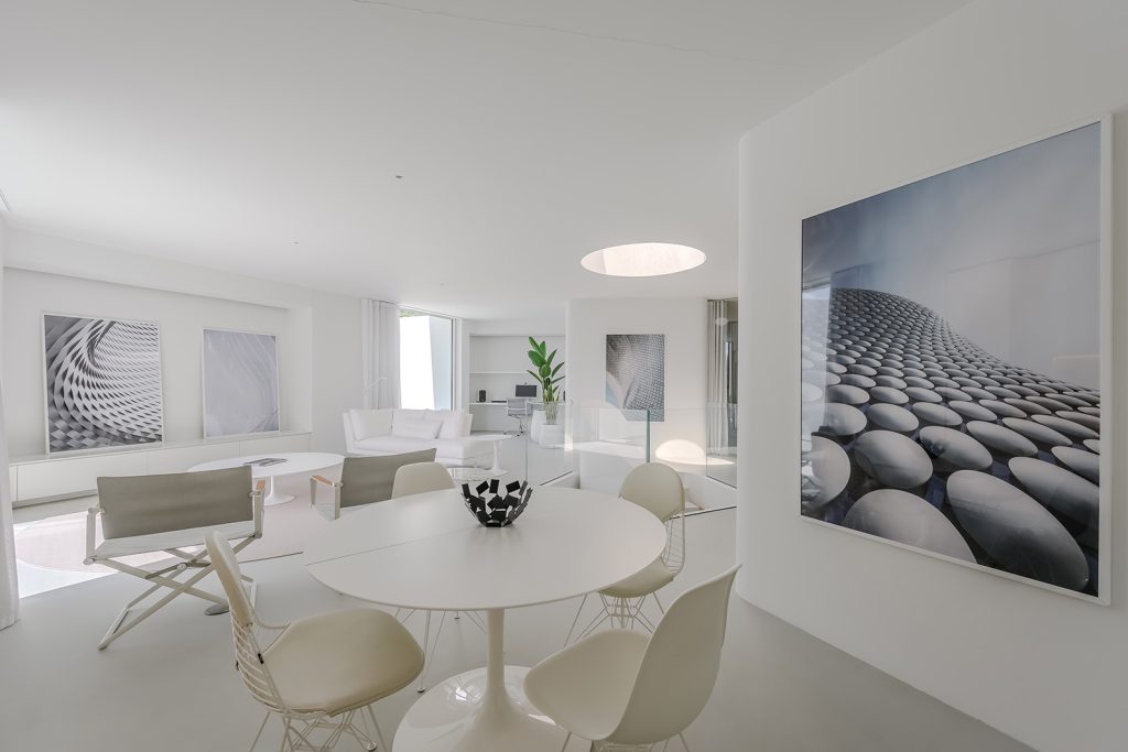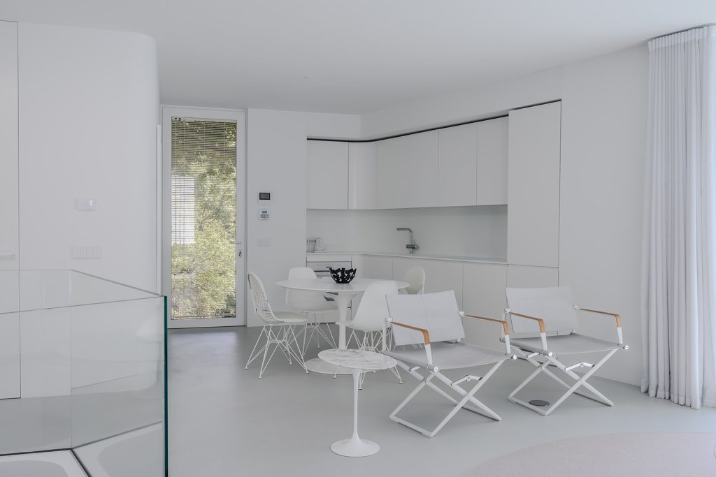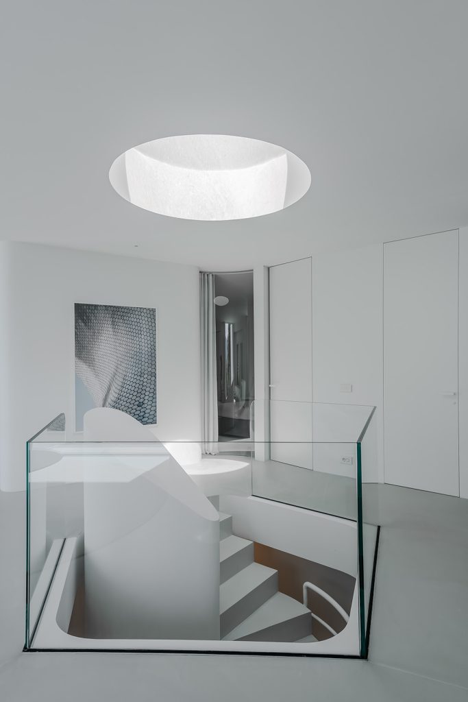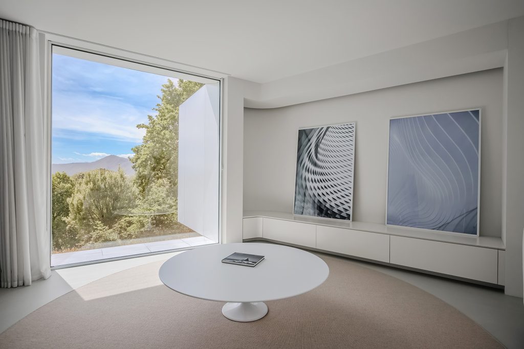 A circular skylight at the centre of the plan draws natural light through the heart of the home and into the basement, where the current owners have carved out space for a media lounge or gym. The open-plan main floor is where the common rooms open to the surroundings. Two bedrooms and two bathrooms are positioned behind semi-transparent ‘pods’ at the rear, equipped with privacy curtains. All the rooms benefit from underfloor heating and controlled ventilation.