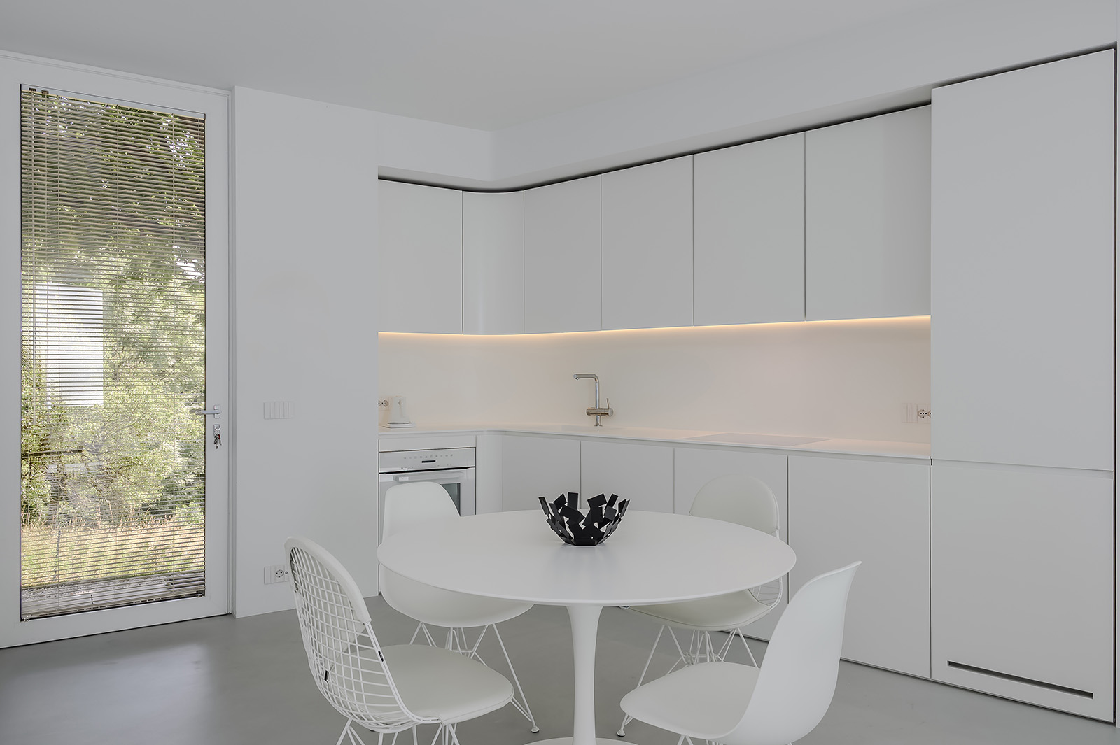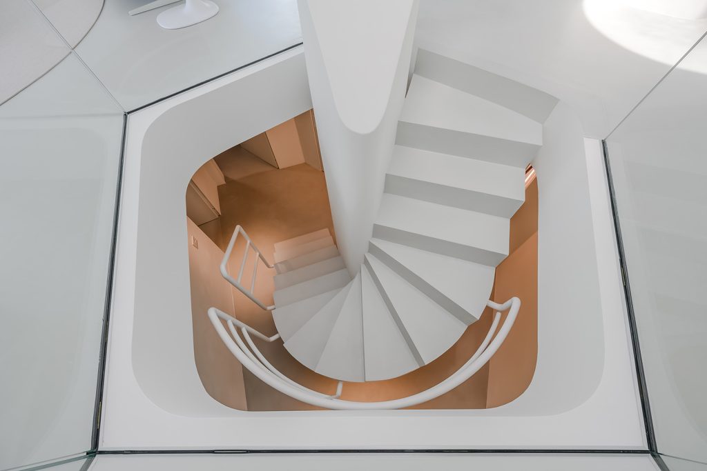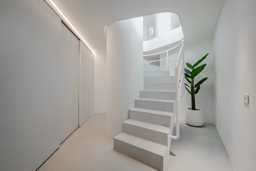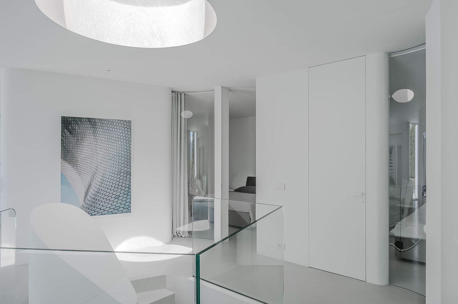 A circular skylight at the centre of the plan draws natural light through the heart of the home and into the basement, where the current owners have carved out space for a media lounge or gym. The open-plan main floor is where the common rooms open to the surroundings. Two bedrooms and two bathrooms are positioned behind semi-transparent ‘pods’ at the rear, equipped with privacy curtains. All the rooms benefit from underfloor heating and controlled ventilation.
