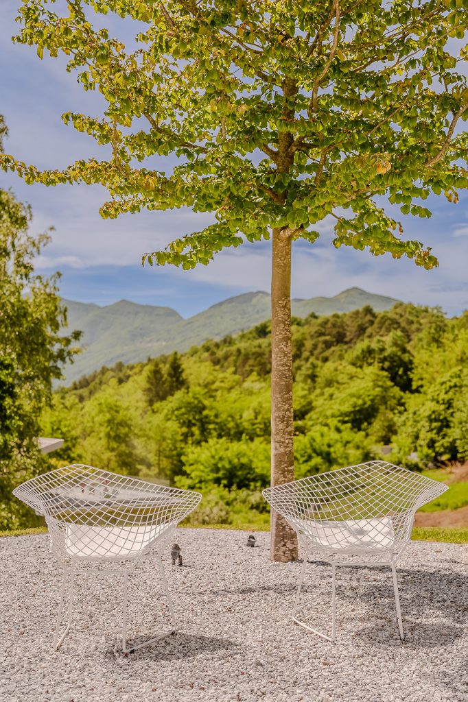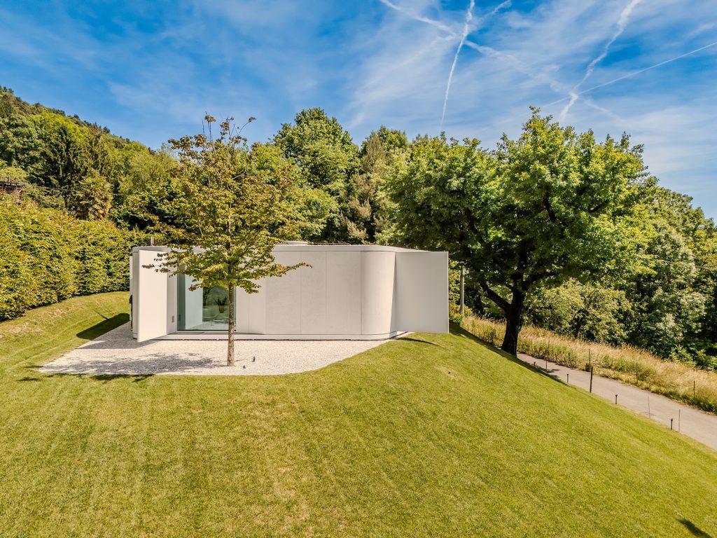 Built in 2021 and now on the market for €995,000, ‘Pinwheel’ is a custom-designed postmodern home five minutes from the shores of Lago Maggiore in Lombardy, Italy. A single above-ground storey in a concrete pentagon formation, it gets its name from the ‘pinwheel panels’ opening out from its large windows and doors, providing views downhill toward the Alps. Together with a hidden basement, the house incorporates 184 sqm.