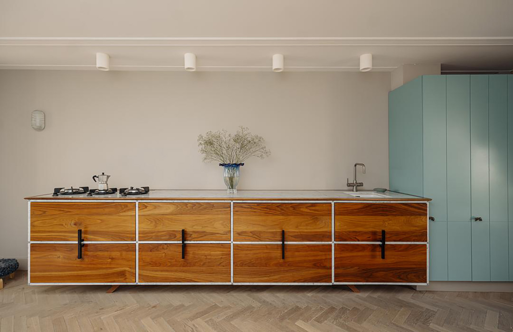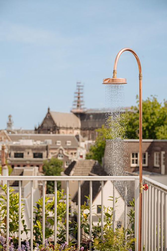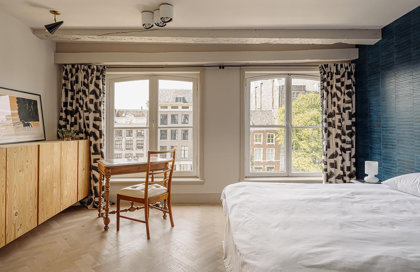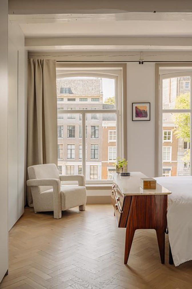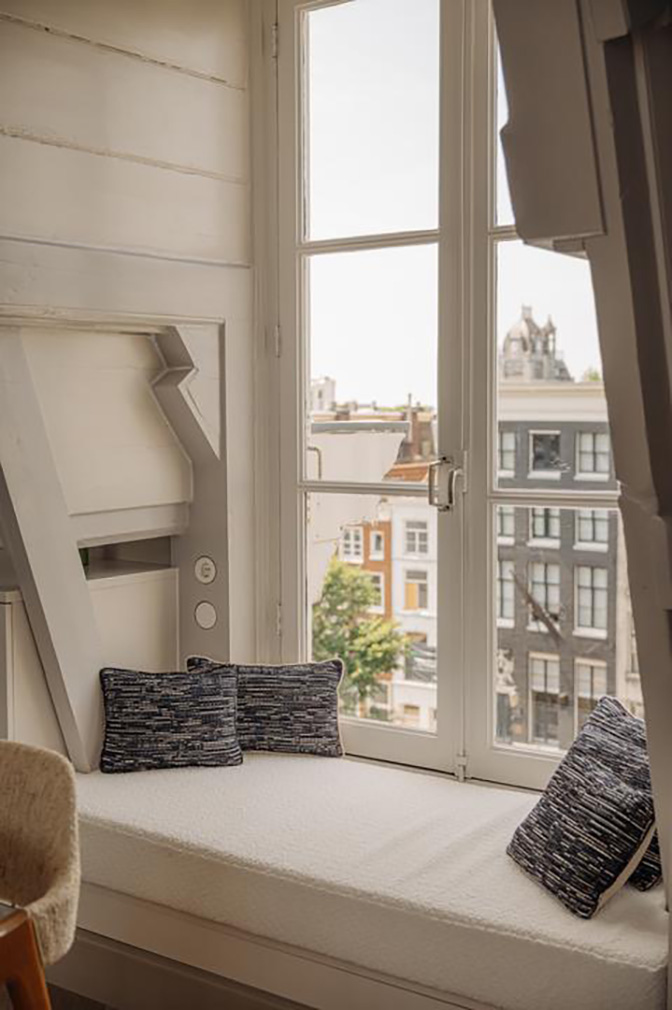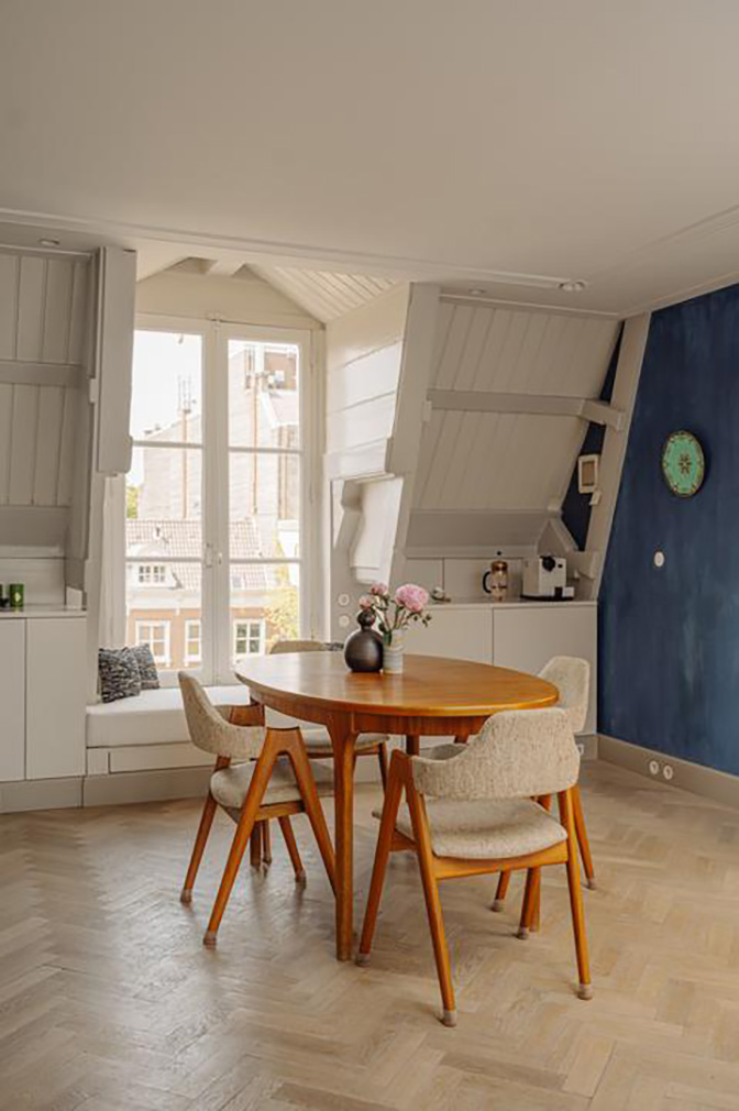 The uppermost floor is given over to living and dining. The bespoke Buro Kif kitchen was conceived as a freestanding object rather than a fitted wall. Window seating frames views across the canal towards the Westerkerk, grounding the interior within its setting. Above it all, a roof terrace offers elevated views across the canal, the Nine Streets and the Jordaan.