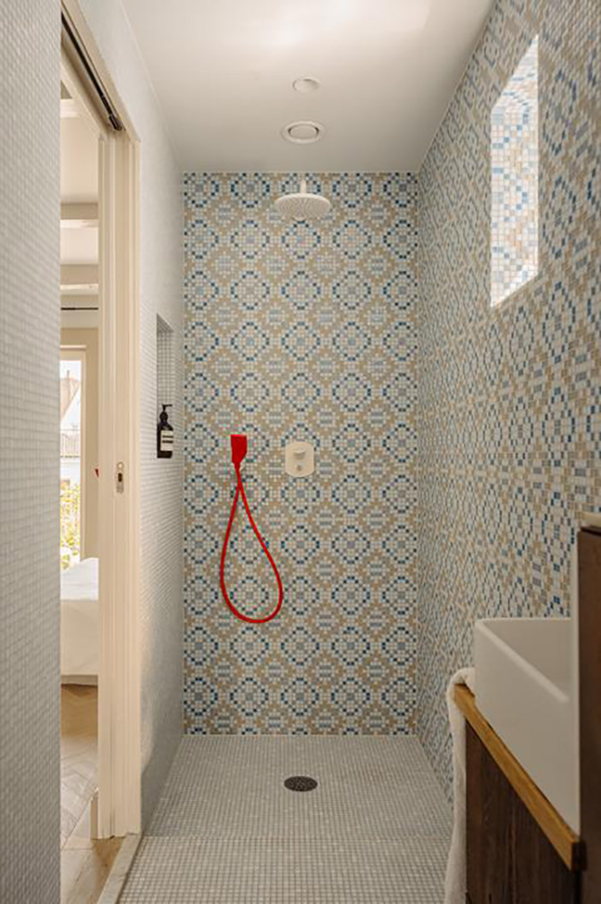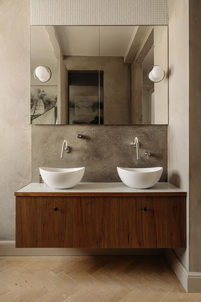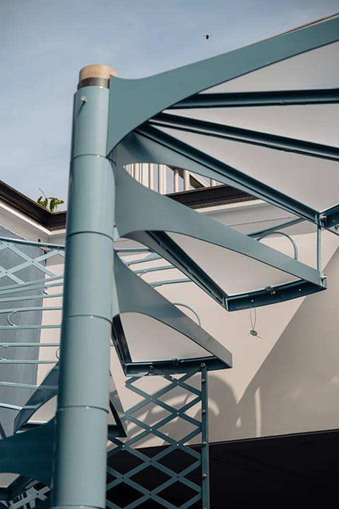 At the centre of the 130sqm plan is a sculptural metal spiral staircase with semi-transparent treads, drawing daylight through the home and connecting the three levels. Bedrooms are arranged across the lower floors, including a full-width principal suite with bespoke storage and an ensuite bathroom. Two further bedrooms occupy the level above, one opening directly onto a small terrace overlooking the rear of the block. Throughout, custom joinery and integrated storage sit quietly against the historic structure, supported by modern interventions such as partial underfloor heating and a domotica automation system.