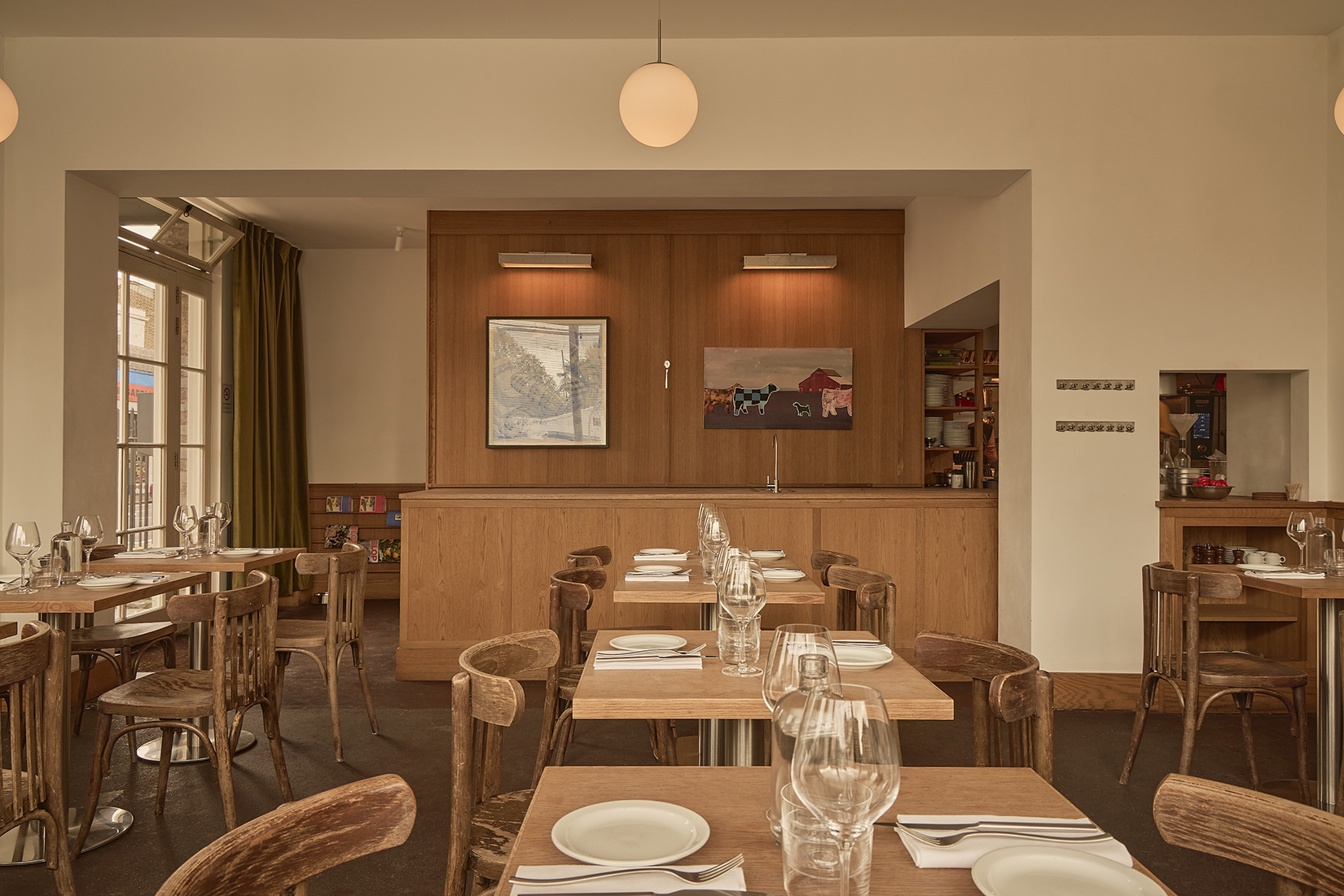 Playful and welcoming: De Beauvoir’s new cafe, named after founder Scott Pattinson’s dog, embraces the beloved puppy’s lively spirit through its quirky design, curated by Pattinson himself alongside local designer Luke MacMahon. Supporting a menu of reimagined classics charged with a touch of nostalgia, the design is a study in simplicity: bright walls, rich brown floors, warm timber panels and closely arranged tables that create a calm, communal atmosphere. Colourful portraits of Albers, created by artists like Hannah Tilson, Billy Crosby and Fraser Sharp, hang on the walls.
