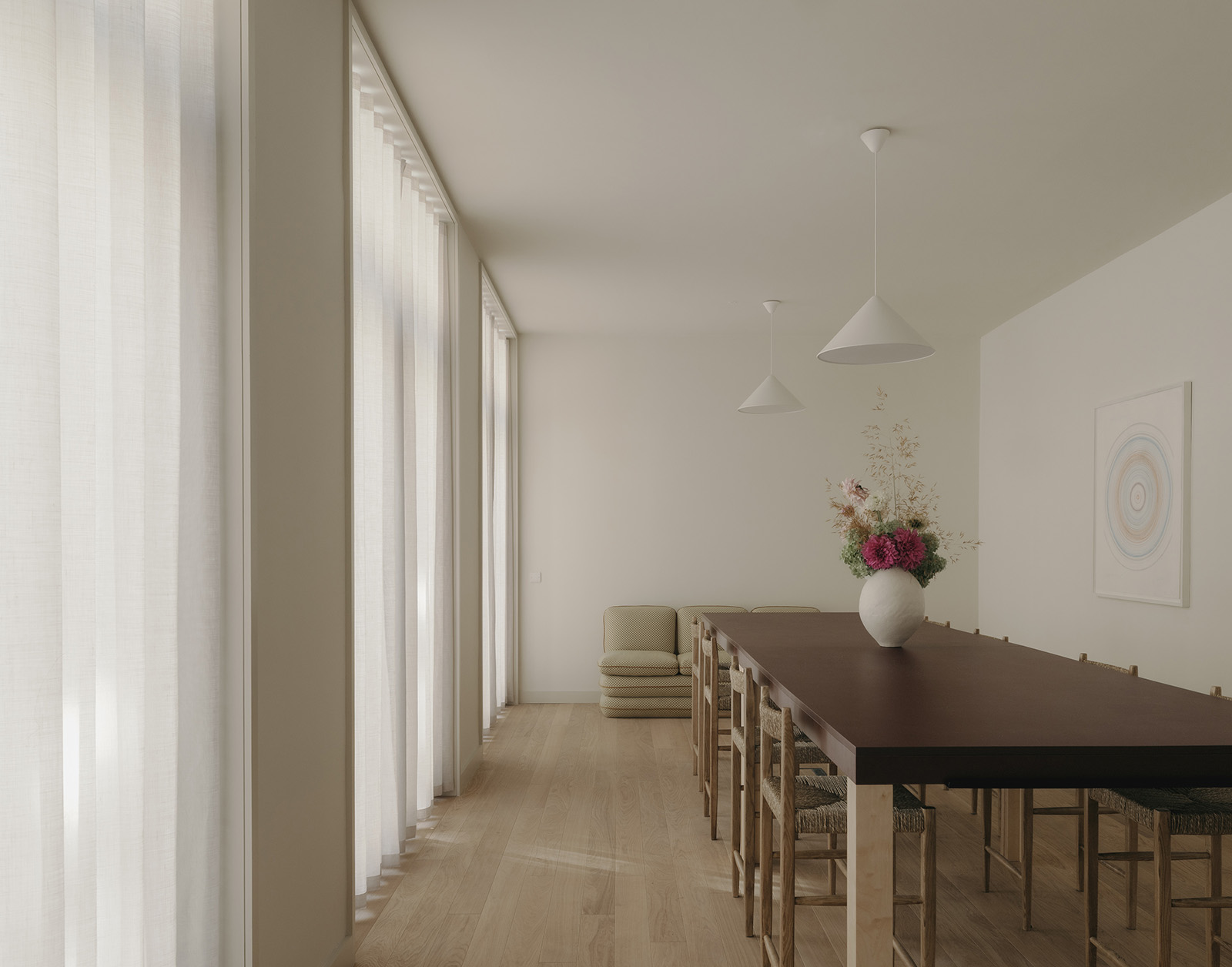 Though each apartment has its own unique floor plan, they share a restrained elegance and consistent creamy palette, allowing the building’s heritage features to take precedence — and offering a canvas for residents. In the kitchens, solid oak flooring is paired with off-white lacquered joinery and terrazzo worktops. Bathrooms more directly reference the building’s civic history with Edwardian-style basins, ribbed glass and tiles with traditional black-edge detailing. Lighting makes a statement in its inconspicuousness. One can draw a clear line from David Chipperfield, Gabriel’s father, in the property’s devotion to light, clarity and generous proportions.
