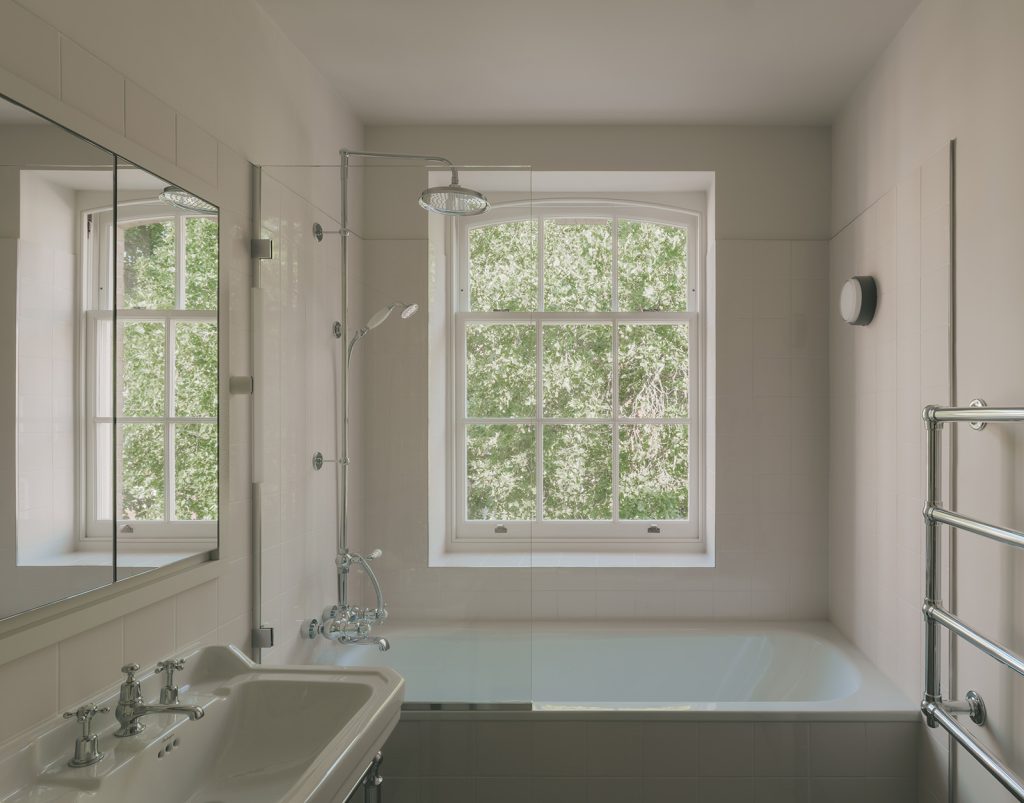 Though each apartment has its own unique floor plan, they share a restrained elegance and consistent creamy palette, allowing the building’s heritage features to take precedence — and offering a canvas for residents. In the kitchens, solid oak flooring is paired with off-white lacquered joinery and terrazzo worktops. Bathrooms more directly reference the building’s civic history with Edwardian-style basins, ribbed glass and tiles with traditional black-edge detailing. Lighting makes a statement in its inconspicuousness. One can draw a clear line from David Chipperfield, Gabriel’s father, in the property’s devotion to light, clarity and generous proportions.