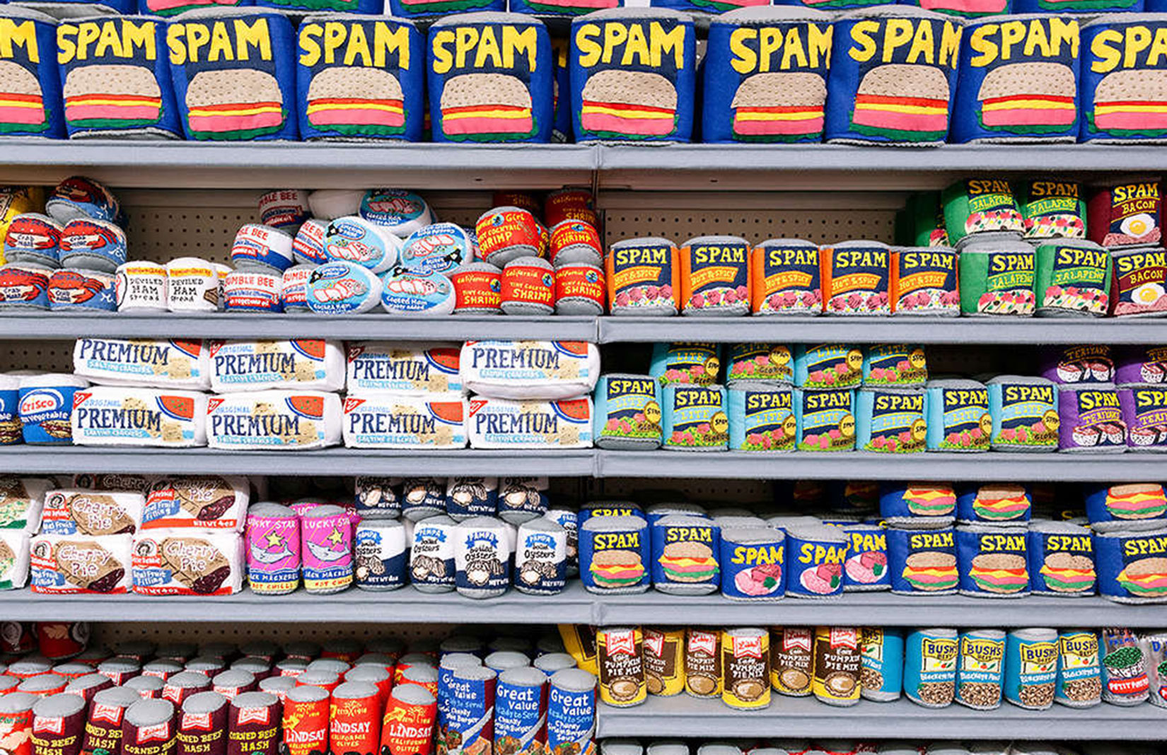 Smiling strawberries and furry cans of spam line the shelves of Lucy Sparrow’s felt supermarket in Downtown Los Angeles.