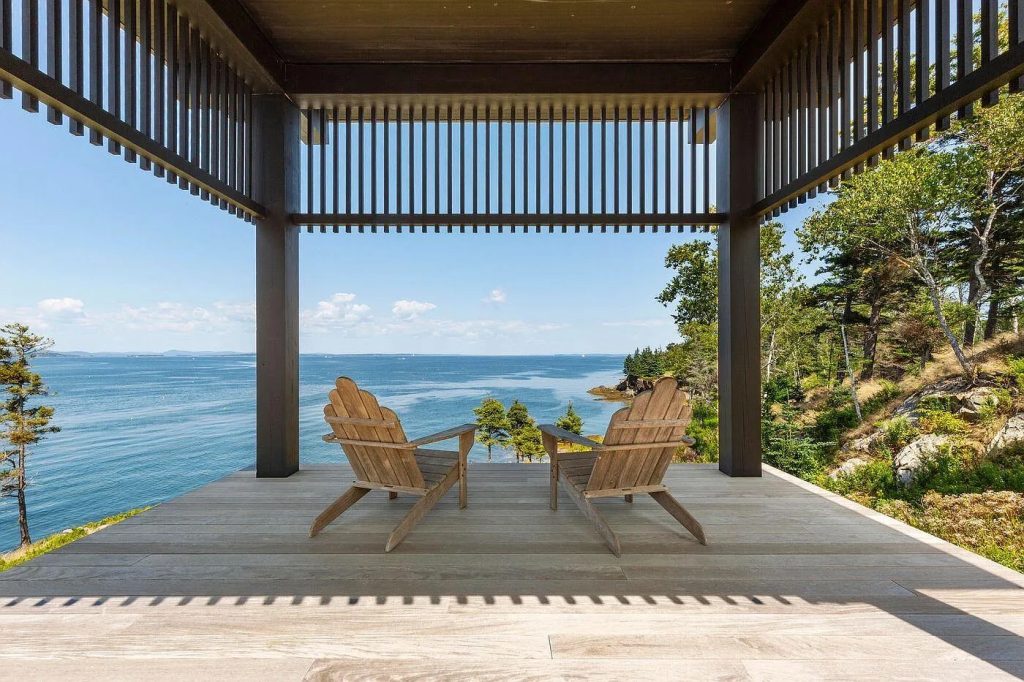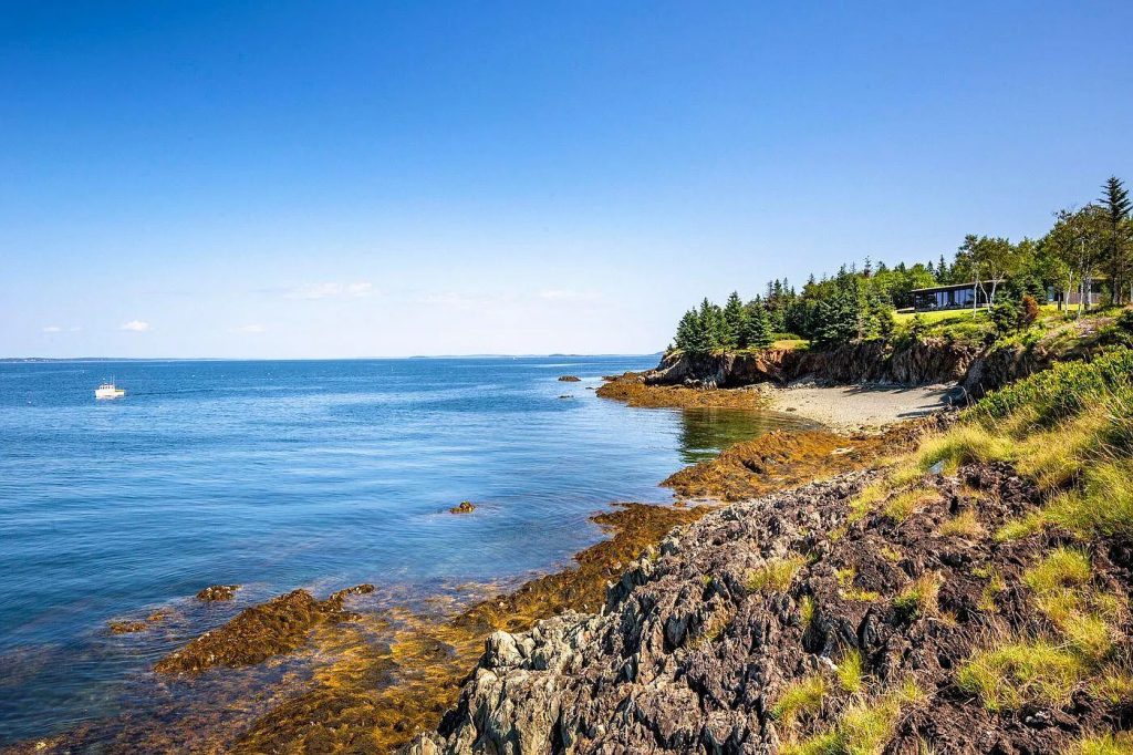 Maine‘s moneyed east coast gets its fair share of gawkers. But not this island on West Penobscot Bay, unknown by Google Maps. Splayed across North Haven’s northwest shore, this new listing sits on 25 private acres landscaped by Michael Van Valkenburgh Associates, with 1,080 feet of granite shorefront and pebble beach. From several curated outdoor living areas, the property gets its own gawking rights over the bay to the Camden Hills.