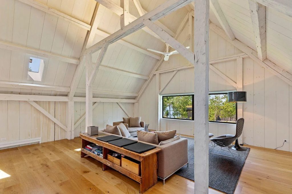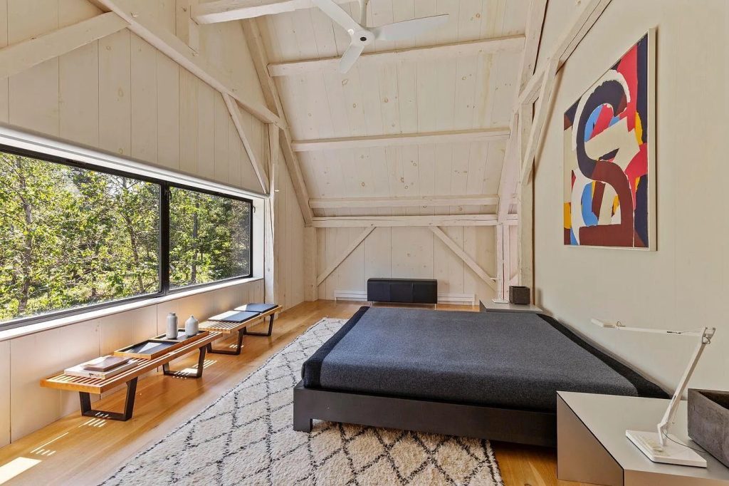 The house was designed by renowned architect Toshiko Mori with one expansive bedroom and an open layout of living and dining areas in a neutral palette of natural materials. Privacy is guarded with the addition of a guest barn, also designed by Mori, containing the garage below. A clean-lined lap pool extends from the main house.