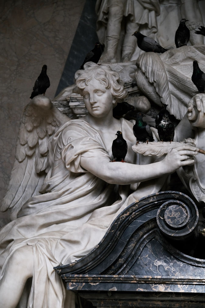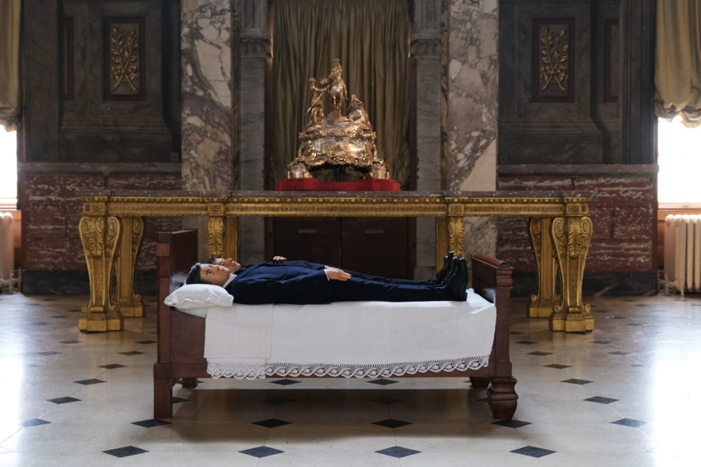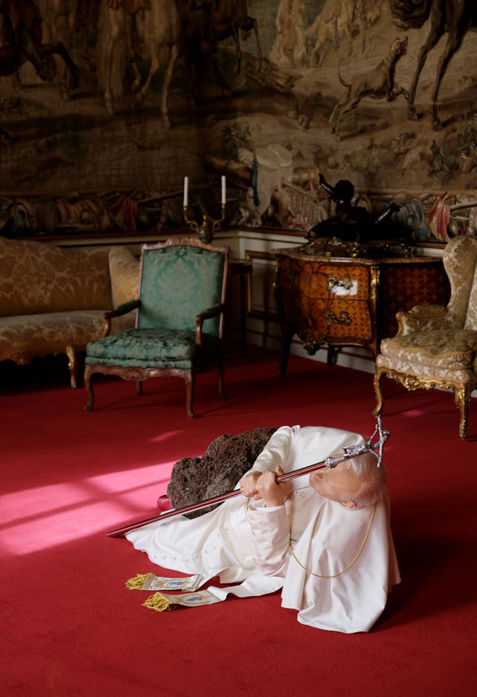 Among them is a sculpture of Hitler praying on his knees inside the palace’s chapel, and a realistic model of Pope John Paul II being hit by a meteorite in one of its stately rooms. Elsewhere, one of the grand ceiling chandeliers has been swapped out for a taxidermied horse in the gallery, and a giant sculpture of Pinocchio floats, face down, in one of the garden’s water fountains.
