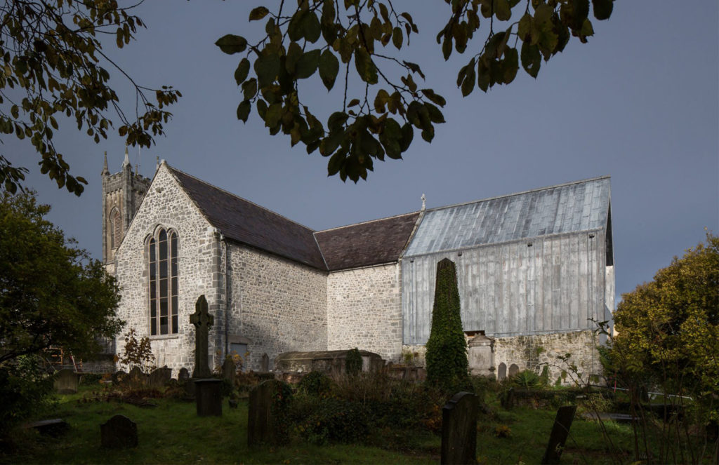 The old part has been joined by a new extension built from timber and lead that blends with the church’s austere facade and blends with the sky.