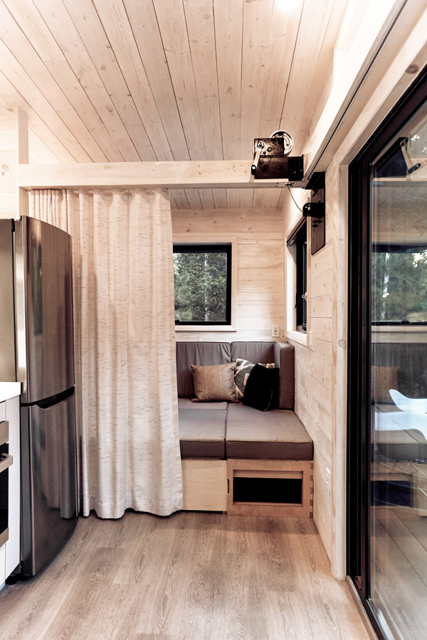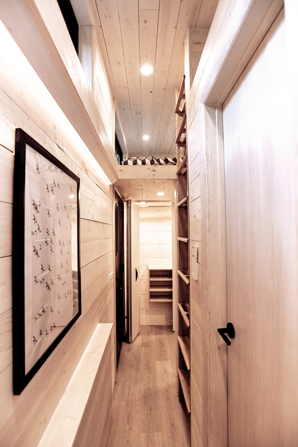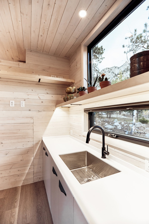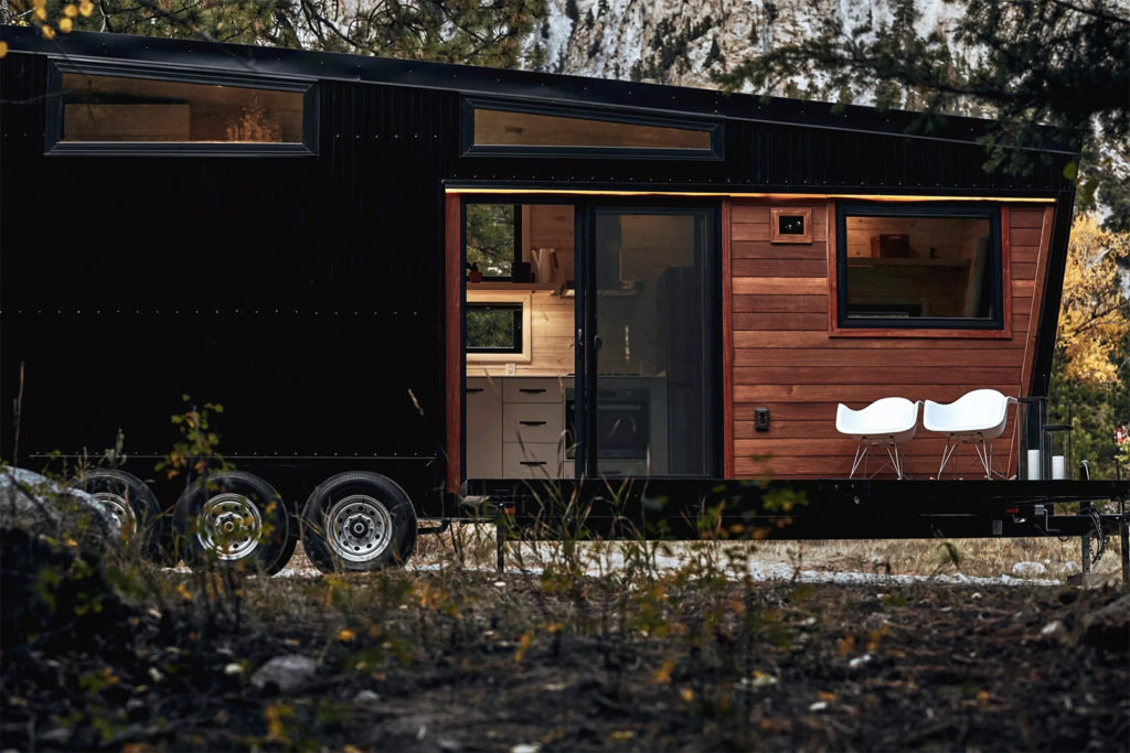 The 300 sq ft mobile home – for sale priced at $144,900 – has a silhouette inspired by the angular shapes and clean lines of modernism. Ceilings are 10-ft-high while interiors have a loose ‘Le Corb cabin’ vibe thanks to pine panelling and clerestory windows.