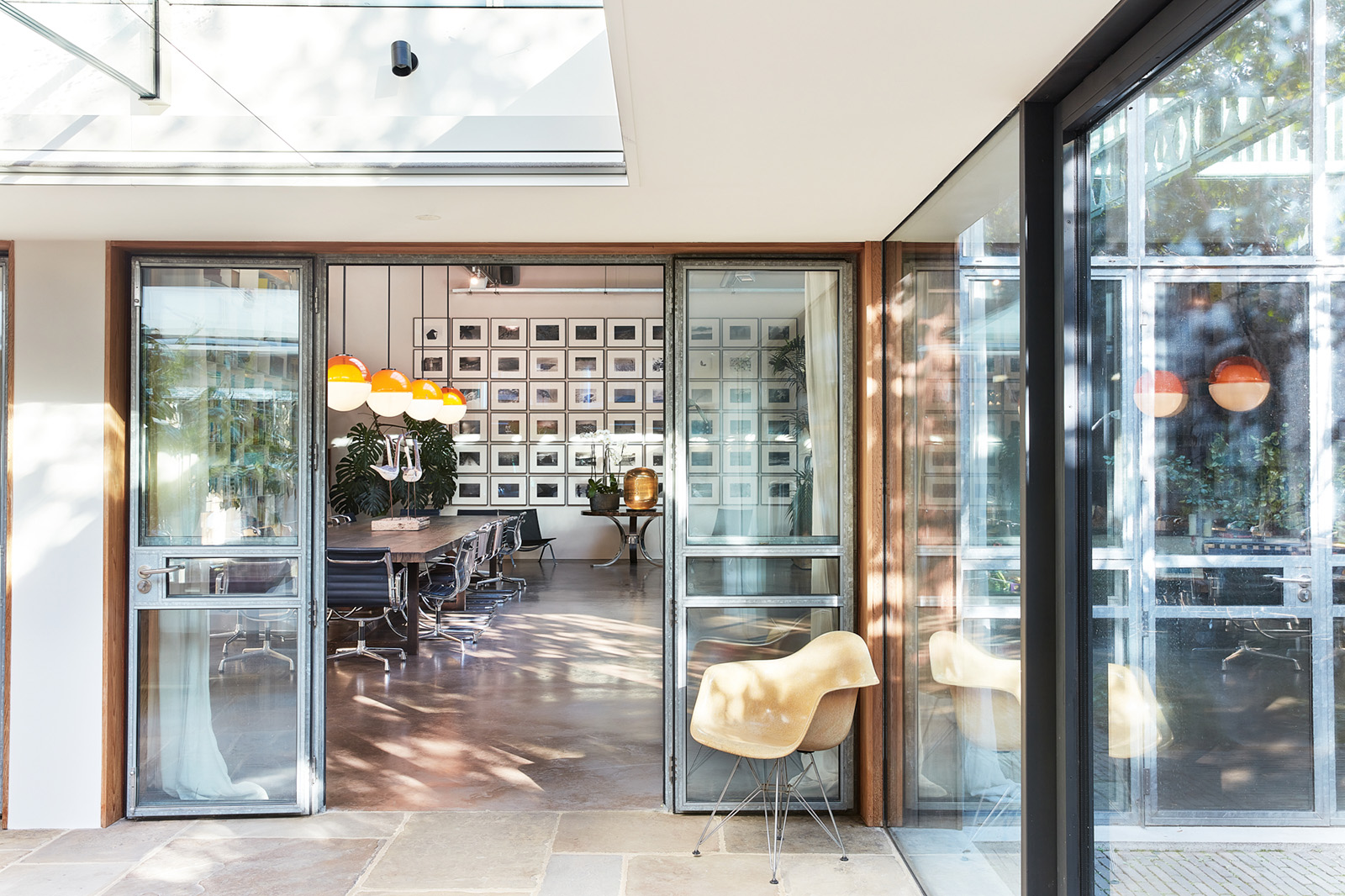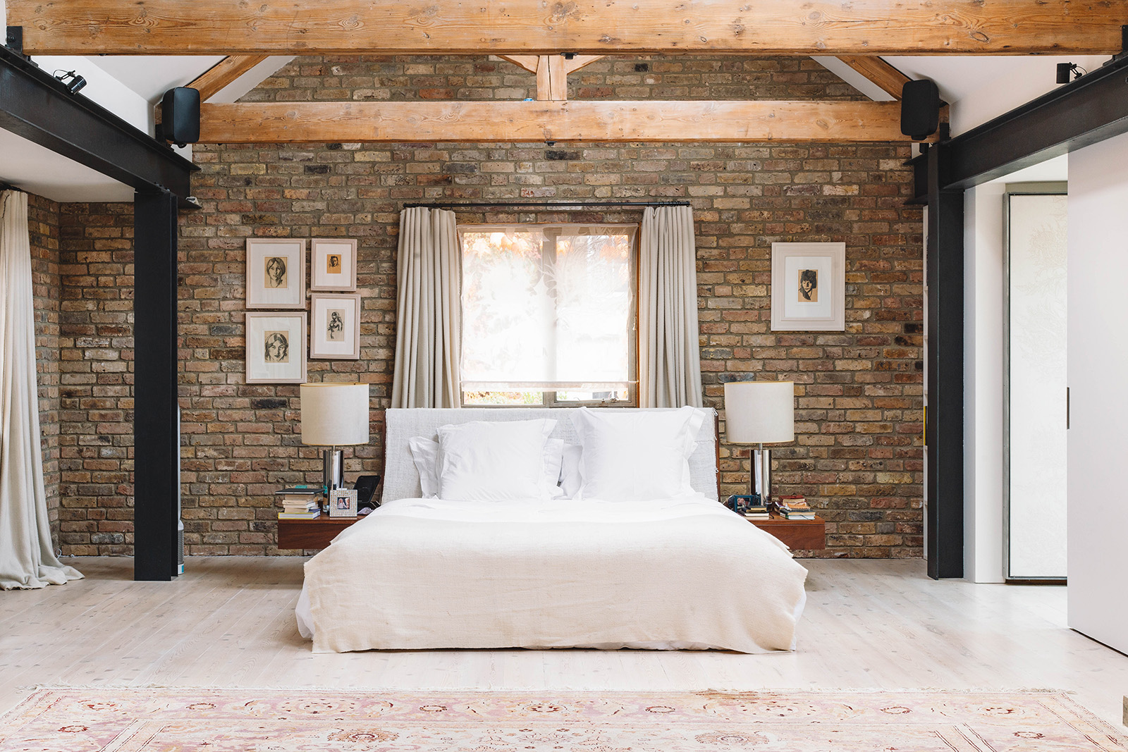 Upstairs is a double-heigh principal bedroom with an exposed structure and ensuite bathroom and dressing room — plus an en suite guest room. The top level has a conservatory-style bedroom and access to the landscaped roof terrace. A glazed bridge leads to a separate studio. There are four bedrooms and four bathrooms in all.