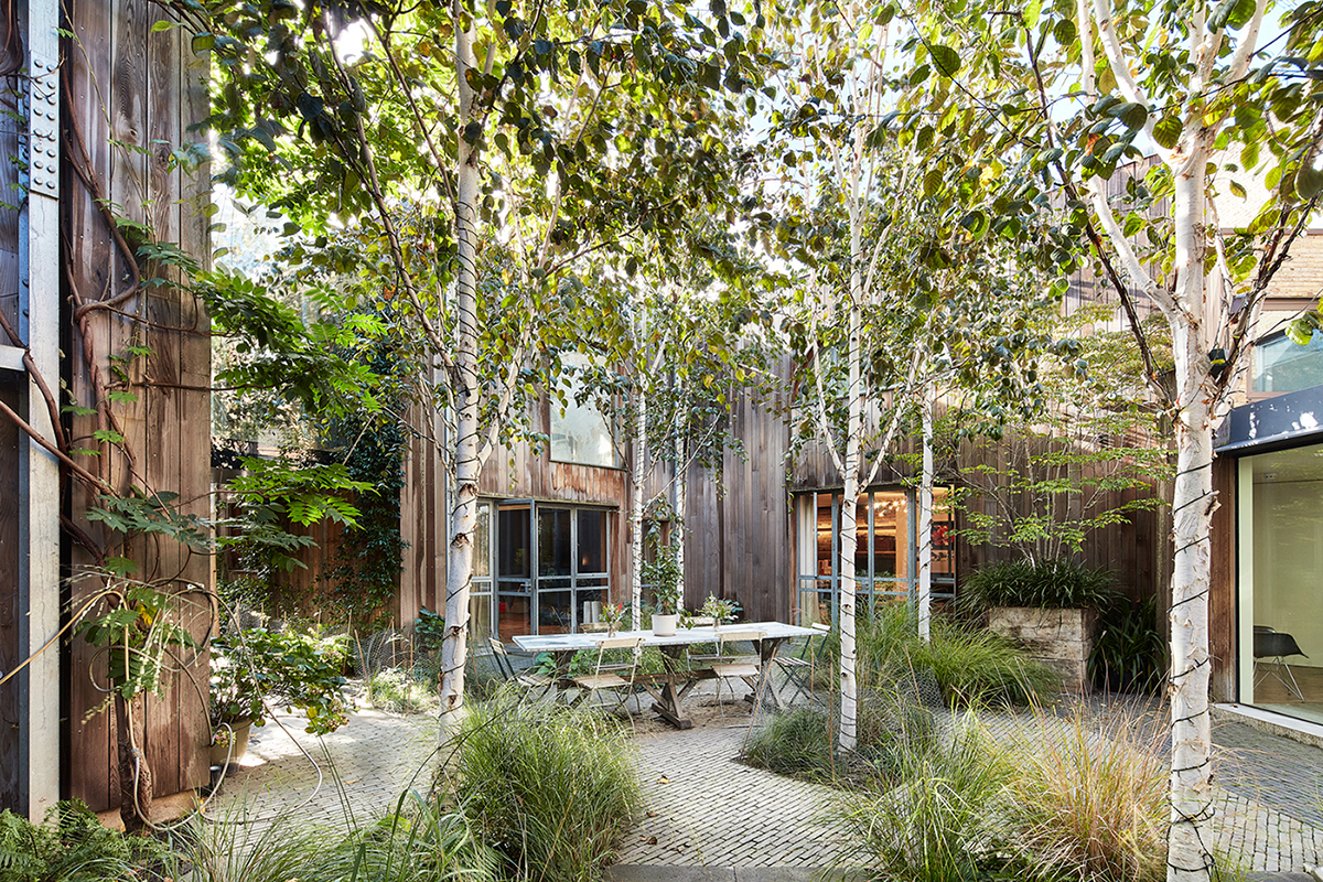 The address is so private it can hardly be photographed. The buildings were sited behind a covered carport, gated entrance and a birch-lined path.