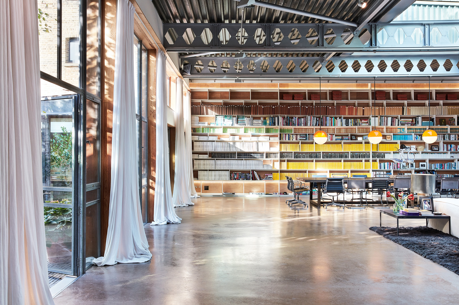 The heart of the home is a major asset: a 4,000sqft open-plan lounge with full-height bookshelves facing a kitchen and dining room. The central skylight is surrounded by steel-girder ceilings 5m tall, over polished-concrete floors. The 18-seat dining table and leather cantilever chairs by Mart Stam and Marcel Breuer are included in the deal, as are two white tuxedo sofas arranged by the brass-faced fireplace. The stainless-steel restaurant kitchen has another table, seating 10, and a sliding ladder to access the towering cabinets.