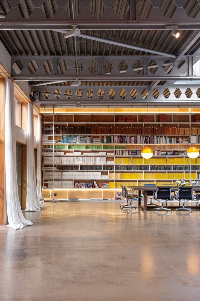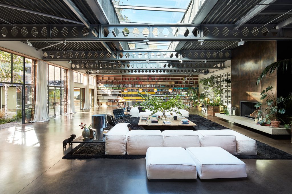 The heart of the home is a major asset: a 4,000sqft open-plan lounge with full-height bookshelves facing a kitchen and dining room. The central skylight is surrounded by steel-girder ceilings 5m tall, over polished-concrete floors. The 18-seat dining table and leather cantilever chairs by Mart Stam and Marcel Breuer are included in the deal, as are two white tuxedo sofas arranged by the brass-faced fireplace. The stainless-steel restaurant kitchen has another table, seating 10, and a sliding ladder to access the towering cabinets.