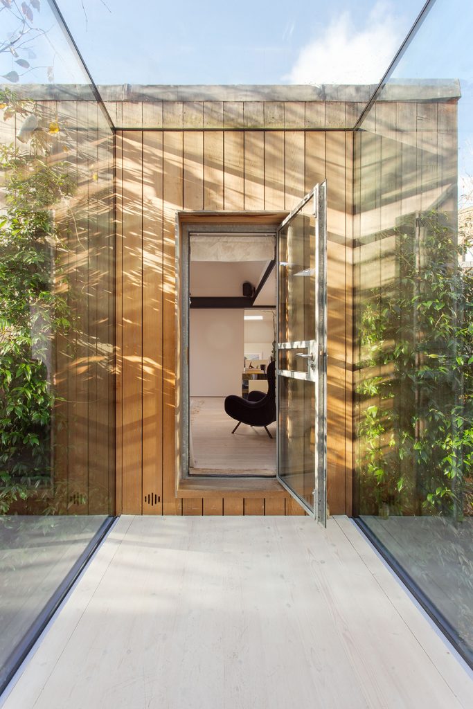 Upstairs is a double-heigh principal bedroom with an exposed structure and ensuite bathroom and dressing room — plus an en suite guest room. The top level has a conservatory-style bedroom and access to the landscaped roof terrace. A glazed bridge leads to a separate studio. There are four bedrooms and four bathrooms in all.
