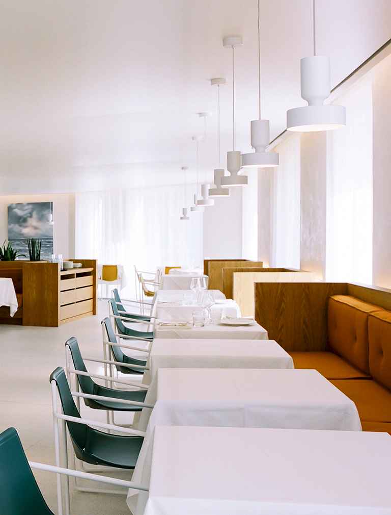 Percheron has taken classic Mediterranean design features of smooth, cool surfaces and made them contemporary and urban. Two white concrete bars feature a recessed square pattern, and there are flashes of dark orange, yellow and dark blue on the seating and green from the row of plants.
