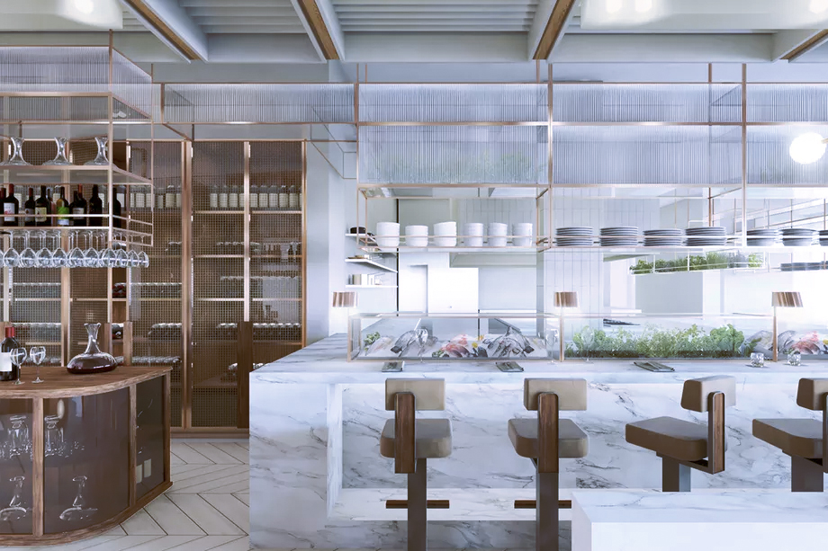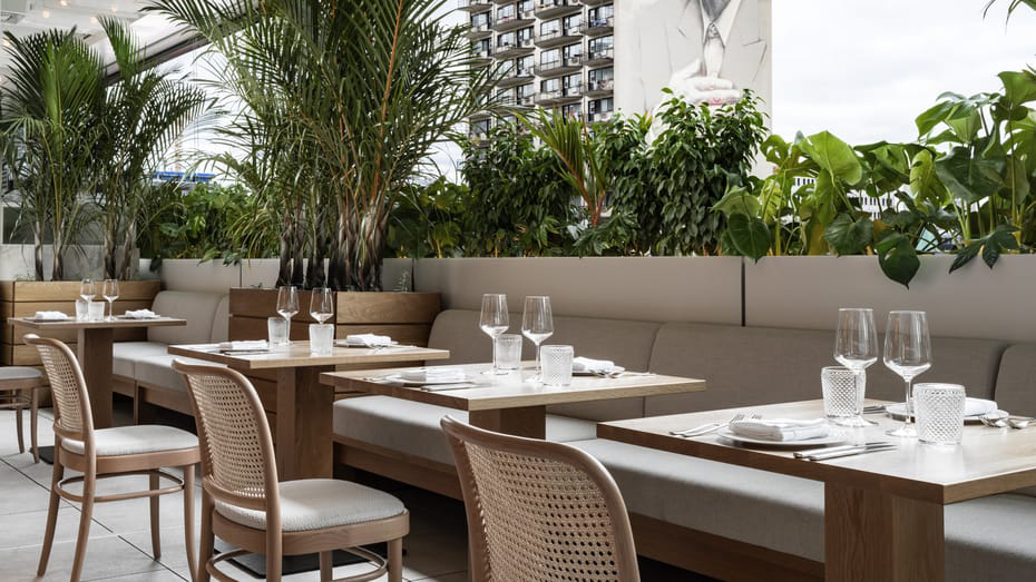 At the heart of the building, local sculptor Pascale Girardin has designed a hanging piece made up of dozens of aluminium flowers that appear to be floating to the ground. Meanwhile, chef Marcus Samuelsson opened his eagerly awaited eponymous restaurant earlier this summer, designed by local talent Atelier Zébulon Perron. The elegant brasserie is layered with wood, marble and brass finishes that evoke an Art Deco vibe, matched by rattan-backed chairs, brown leather banquettes and circular booths.