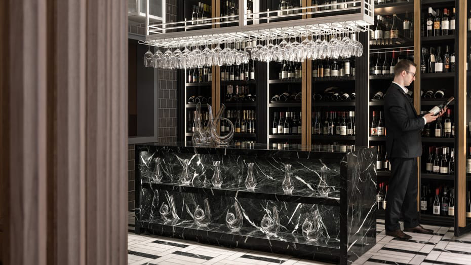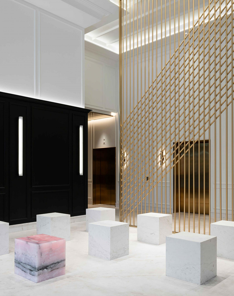 The hotel’s interiors by designers Gilles & Boissier and Philip Hazan are a stark contrast to the exterior of the black glass building designed by architecture firms Lemay and Sid Lee Architecture in the city’s Golden Square Mile.
