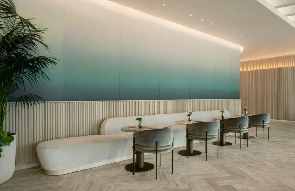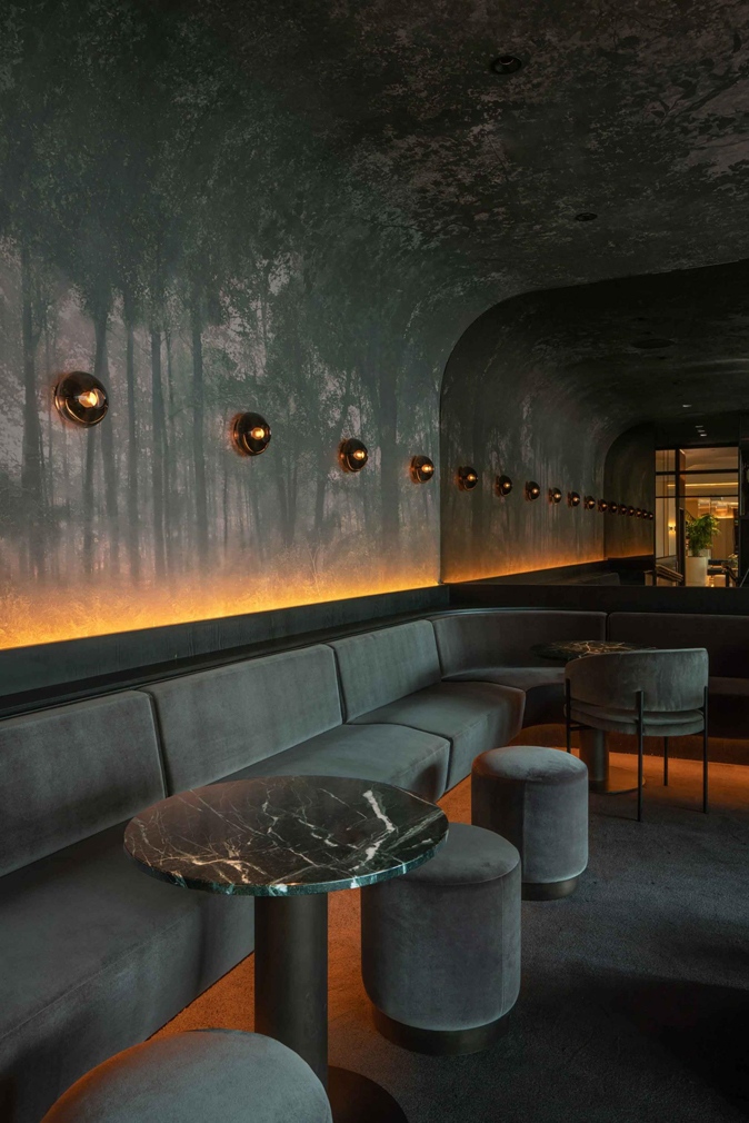 Communal areas range from a dark grey lounge, punctuated with brass wall-lights and covered in forest-patterned wallpaper, to a lobby that’s bathed in a wash of pastels and pale parquet flooring.
