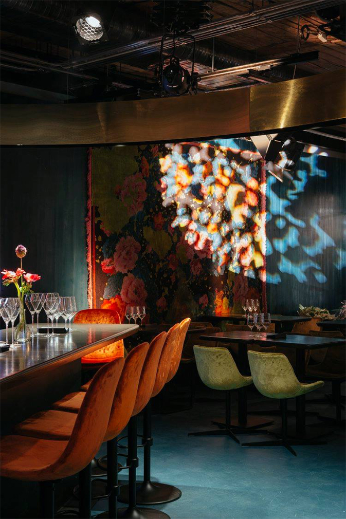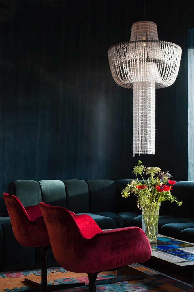 A dramatic brass chandelier, custom designed by the practice, also hangs above the bar, casting the lounge in a moody glow.