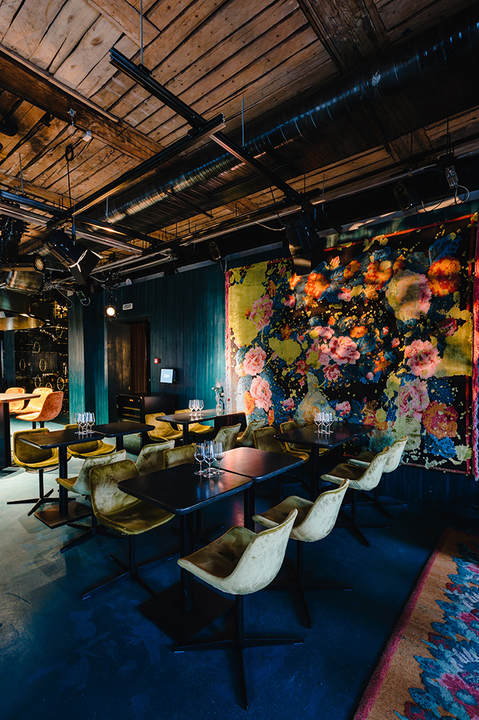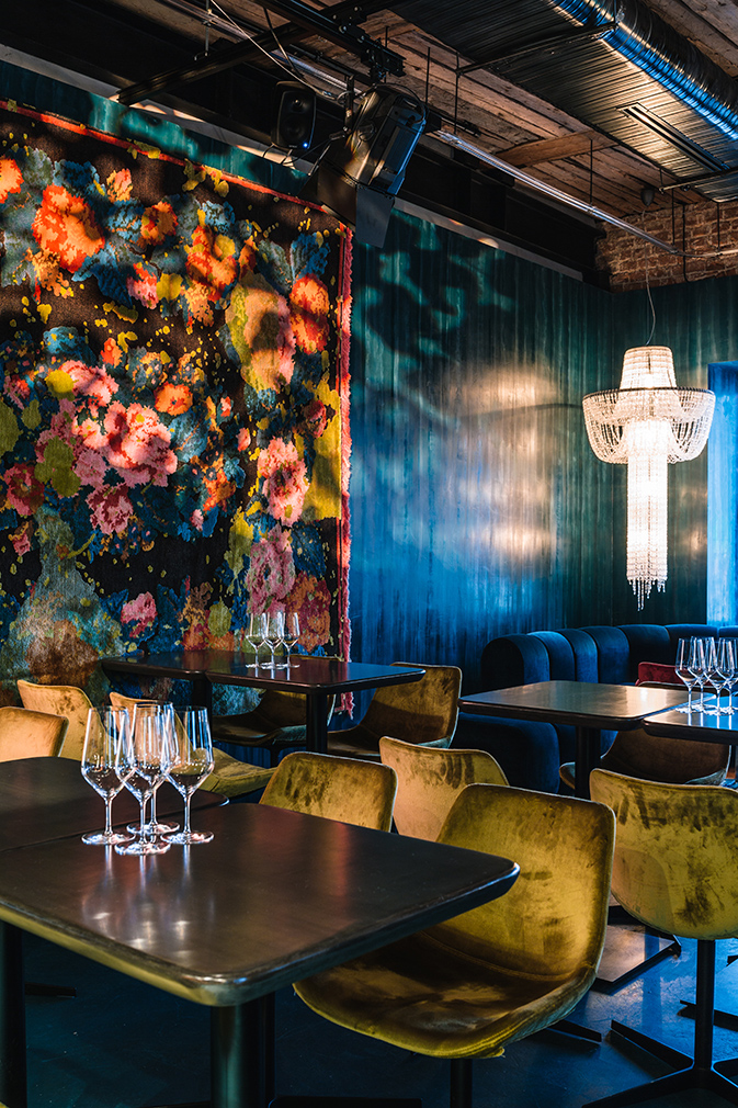 Sumptuous textures come from crushed velvet sofas and chairs, which sit atop enormous floral rugs designed by Jan Kath that are also used as wallhangings (a nod to Russian tradition).