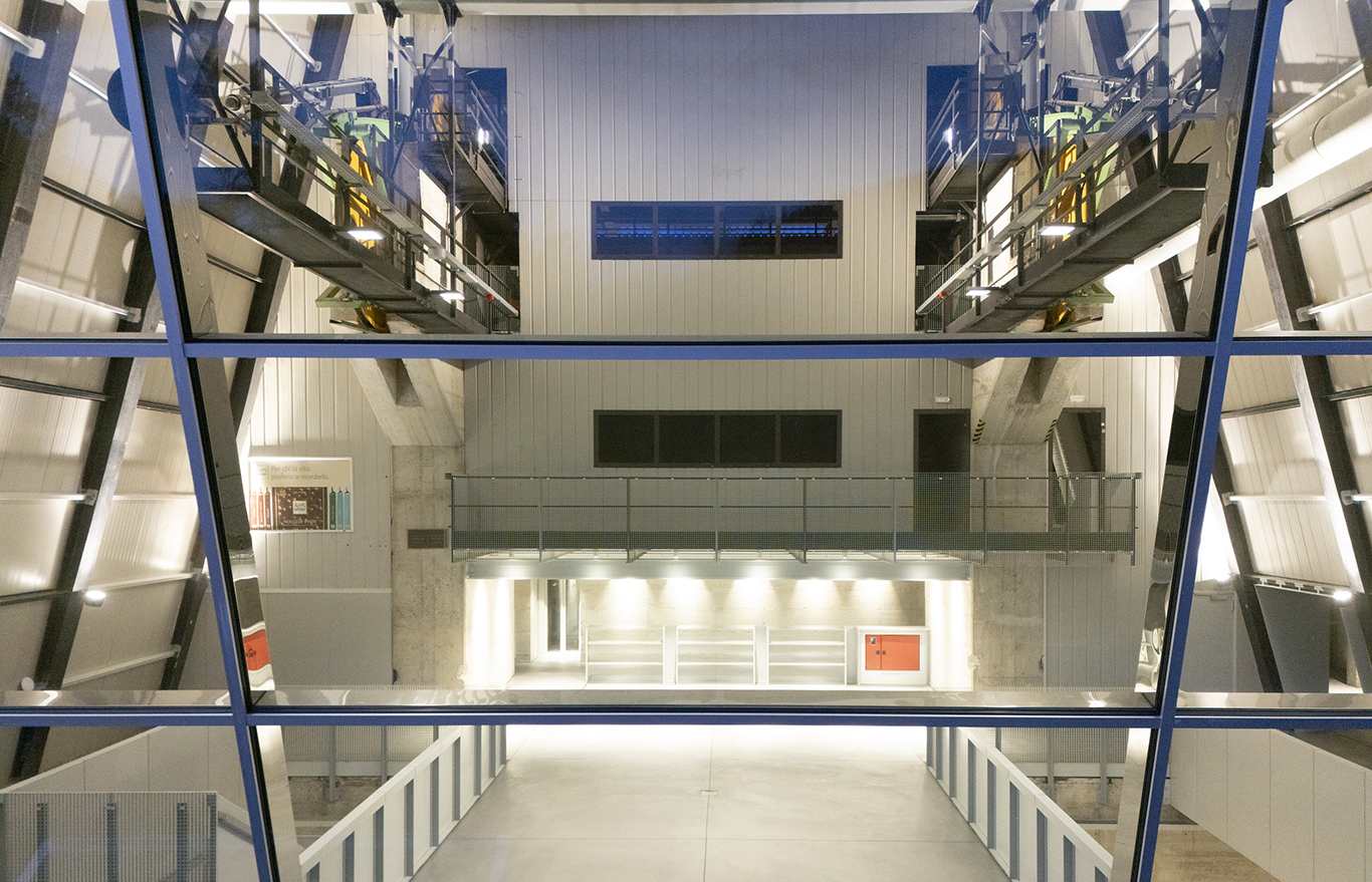 The path continues past disused pulleys, cables and gears in vivid colours, like ingredients in a kinetic artwork. In and out of old workshops, storerooms and a small cinema, visitors take in anecdotes from Messner’s legacy and reflect on themes of sustainability, slow travel, silence, risk and mountain exploration. The exhibition opens to a wide glazed façade beneath a trapezoidal opening in the roof, originally conceived for the arrival of the lift cabins. This viewing platform juts into the landscape: the icing on this sweet Alpine scene.