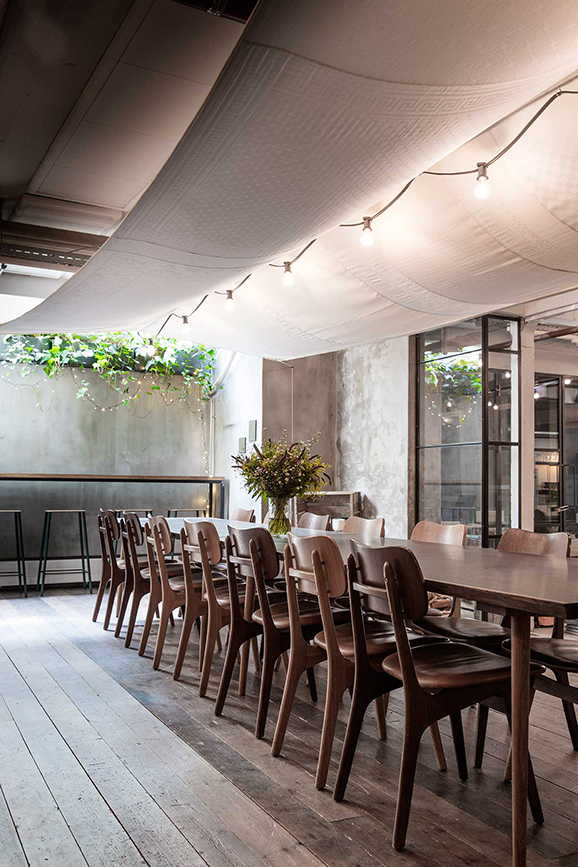 At the heart of the two-storey space is a greenhouse packed with suspended plant pots. A feature back wall on the ground floor also has different species of plants stacked on a bookcase. The restaurant’s menu, devised by chef Jonas Christensen, mirrors the space’s emphasis on greens.