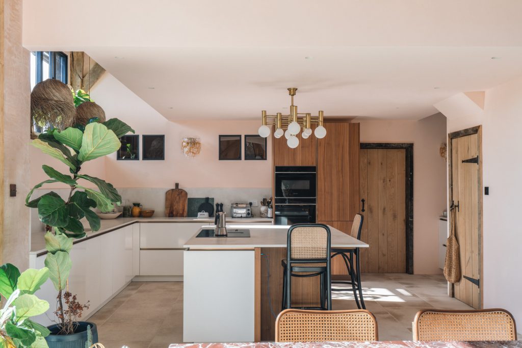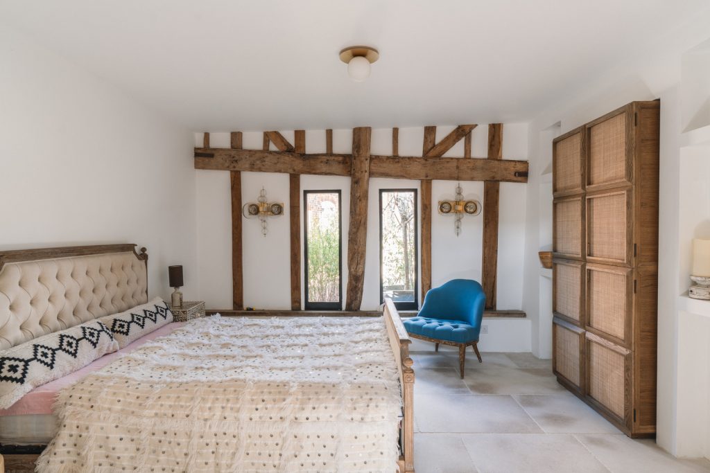 Inside, more than 2,470 square feet are arranged across two floors, anchored by a double-height open-plan living space. Exposed beams, raw plaster walls and historic brickwork remain visible, establishing a restrained material palette. Stone floors run throughout the ground level, paired with underfloor heating powered by an air-source heat pump. The kitchen combines white and ridged walnut cabinetry with quartz worktops and integrated appliances, while a mezzanine level sits among the rafters as a flexible additional space. Bedrooms are positioned at either end of the plan and upstairs, each with an en suite bathroom.
