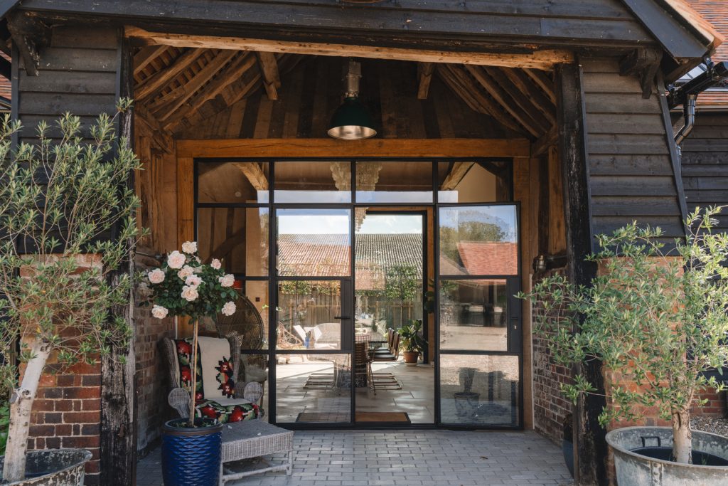 Barn Owl is contained by its original timber frame and agricultural volume, set along a quiet lane in Kimpton, Hertfordshire. Built in the late 1700s and later adapted, the Grade II-listed barn has now been converted into a three-bedroom house, with the intervention focused on retaining structure and introducing contemporary systems. Black weatherboarding and a tiled roof reference its working past, while large glazed openings signal its new role. The house is listed for £1.65 million with The Modern House.